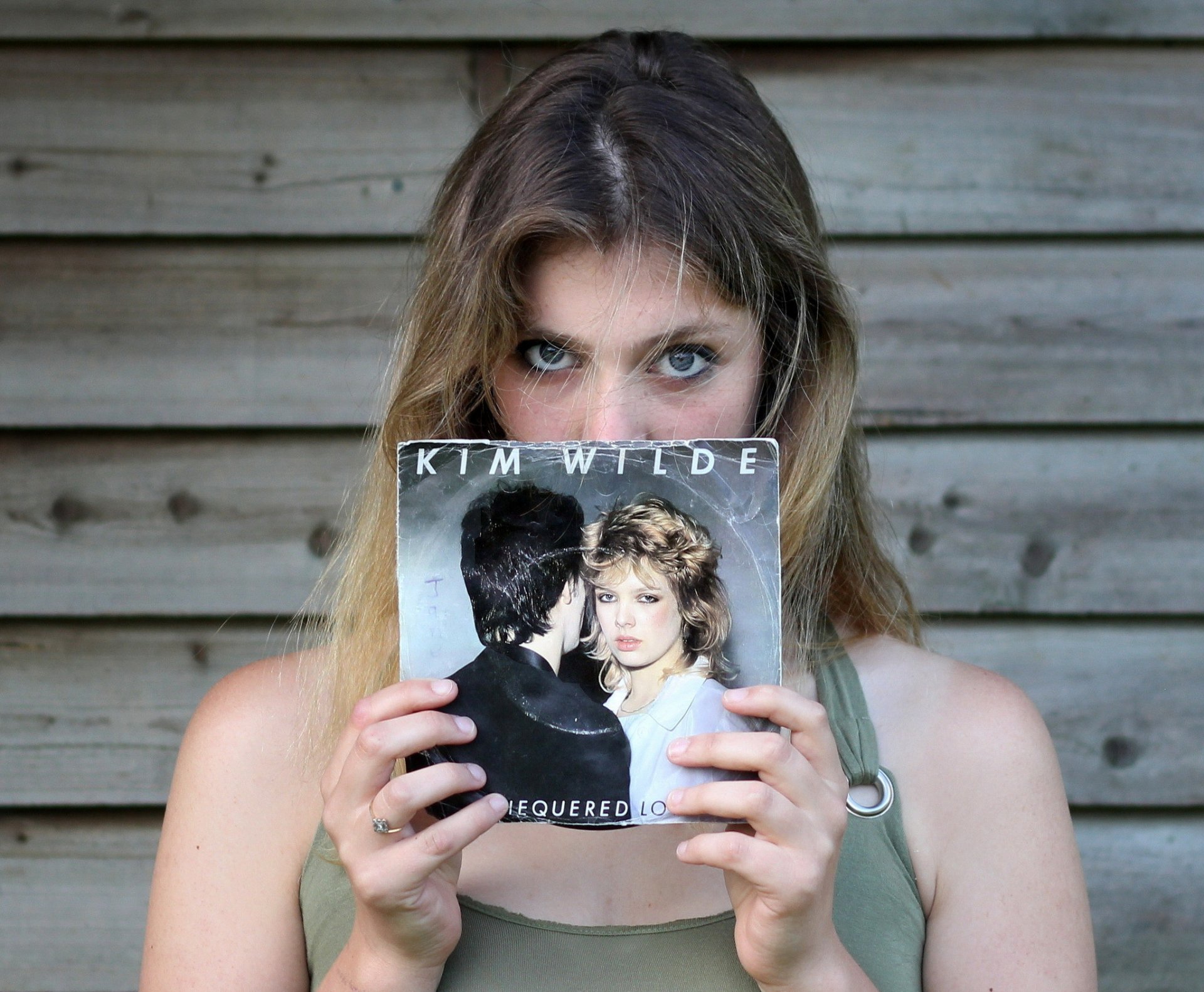 Photo dramatique d'une fille en manteau noir sur fond de lac et de forêt grise sans feuillage