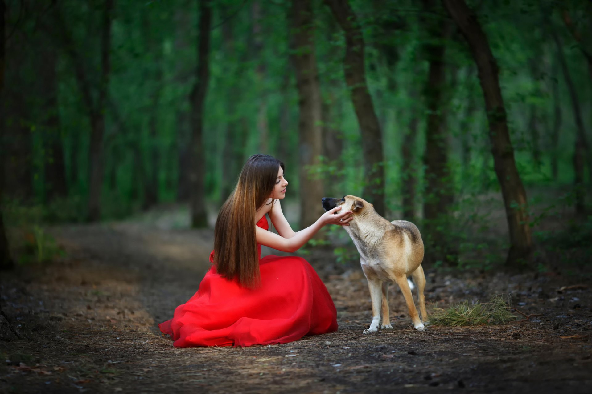 La jeune fille dans une robe rouge, avec le chien. Проогулка dans la forêt