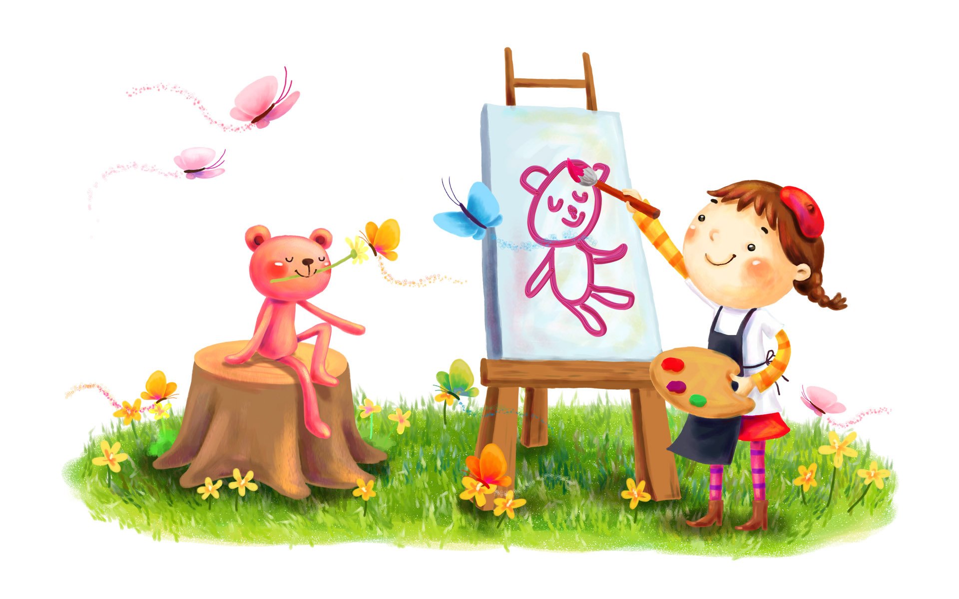 Sur la pelouse de l'été, la jeune fille peint avec des peintures sur toileSur la pelouse de l'été, la jeune fille peint avec des peintures sur toile