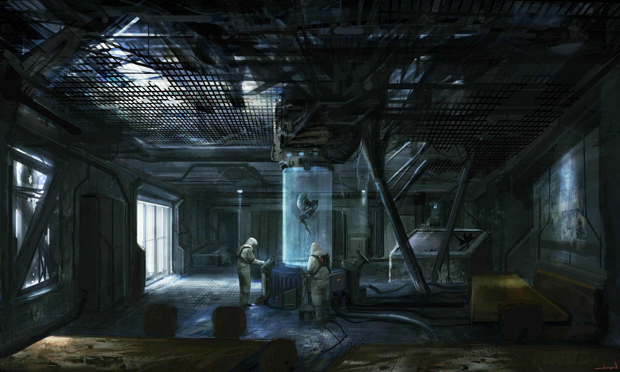 Les scientifiques de personnes invoquent dans le laboratoire au-dessus d'un monstre dans une fiole