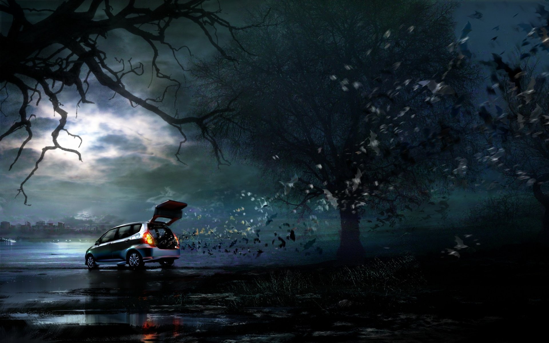 Une voiture sinistre libérant des chauves-souris du coffreUne voiture sinistre libérant des chauves-souris du coffre