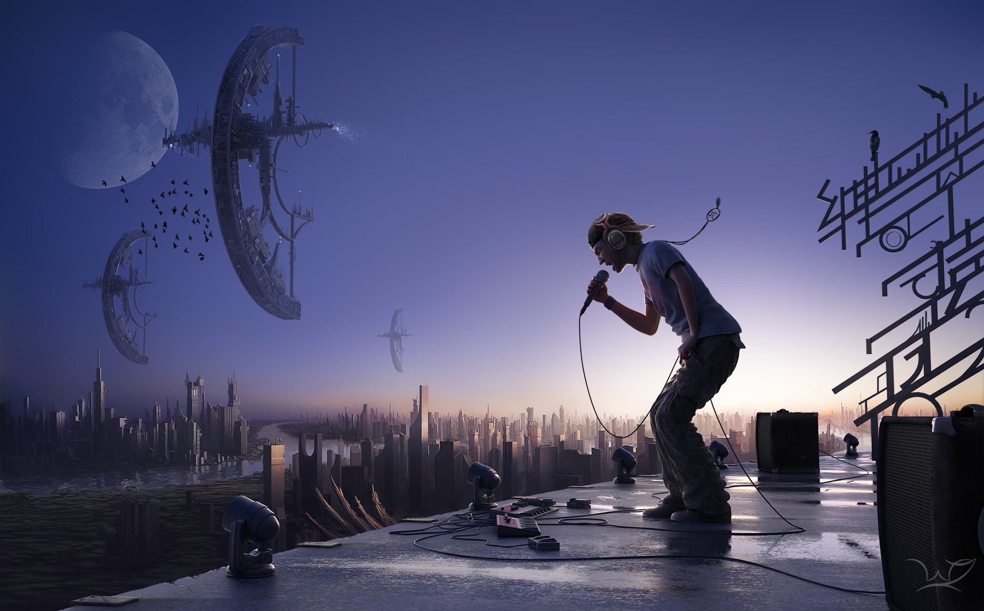 Le chanteur se produit dans un grand spectacle sous de beaux effets