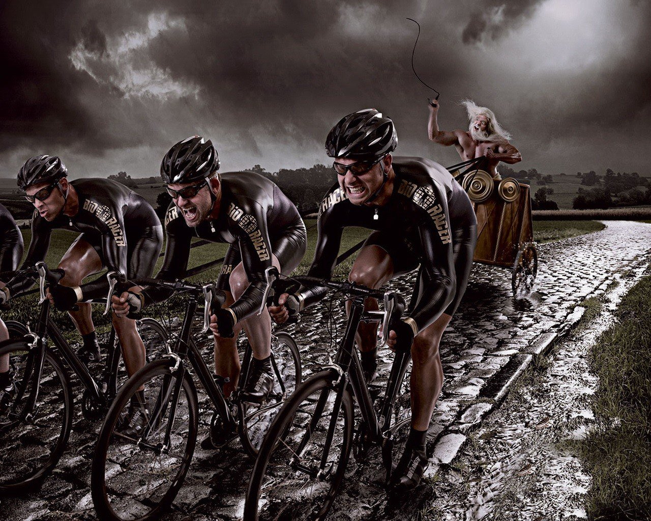 Les cyclistes par le chariot sur le fond résistant aux intempériesLes cyclistes par le chariot sur le fond résistant aux intempéries