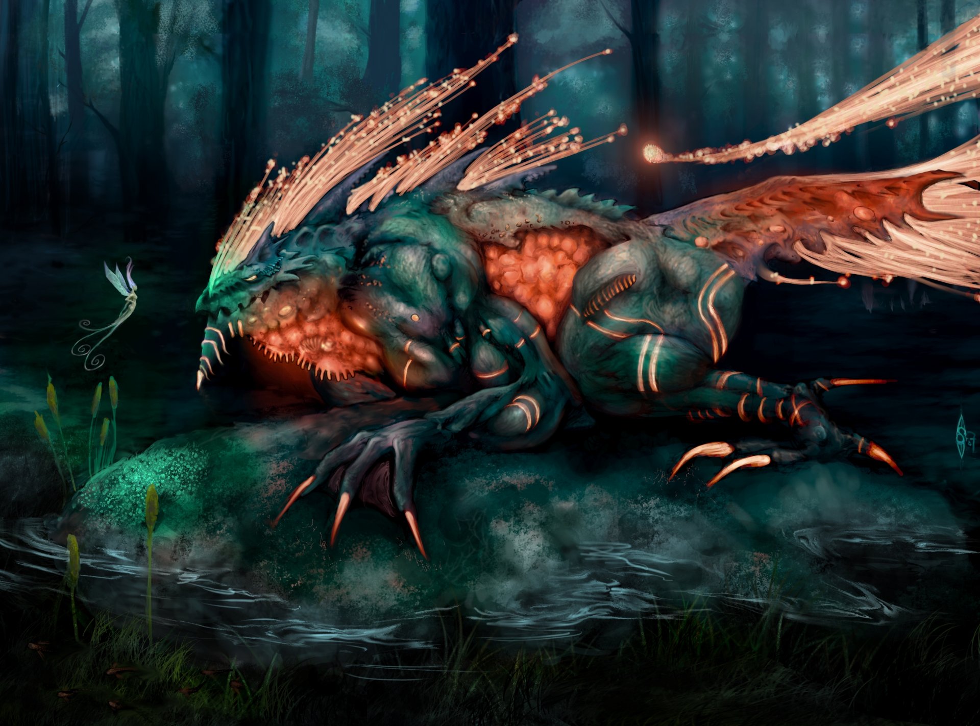 Art du dragon terrifiant dans le marais avec des crânesArt du dragon terrifiant dans le marais avec des crânes