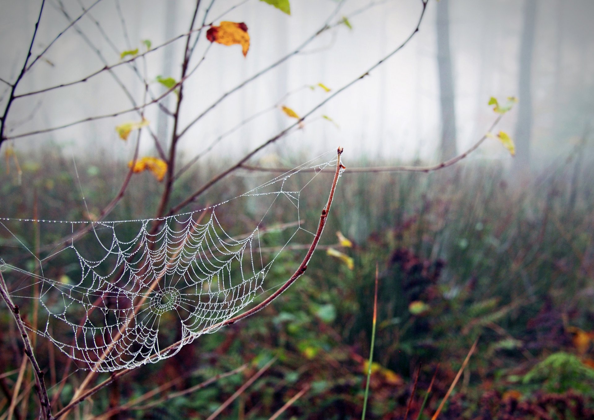 Toile d'araignée dans les gouttes de rosée dans la forêt d'automne