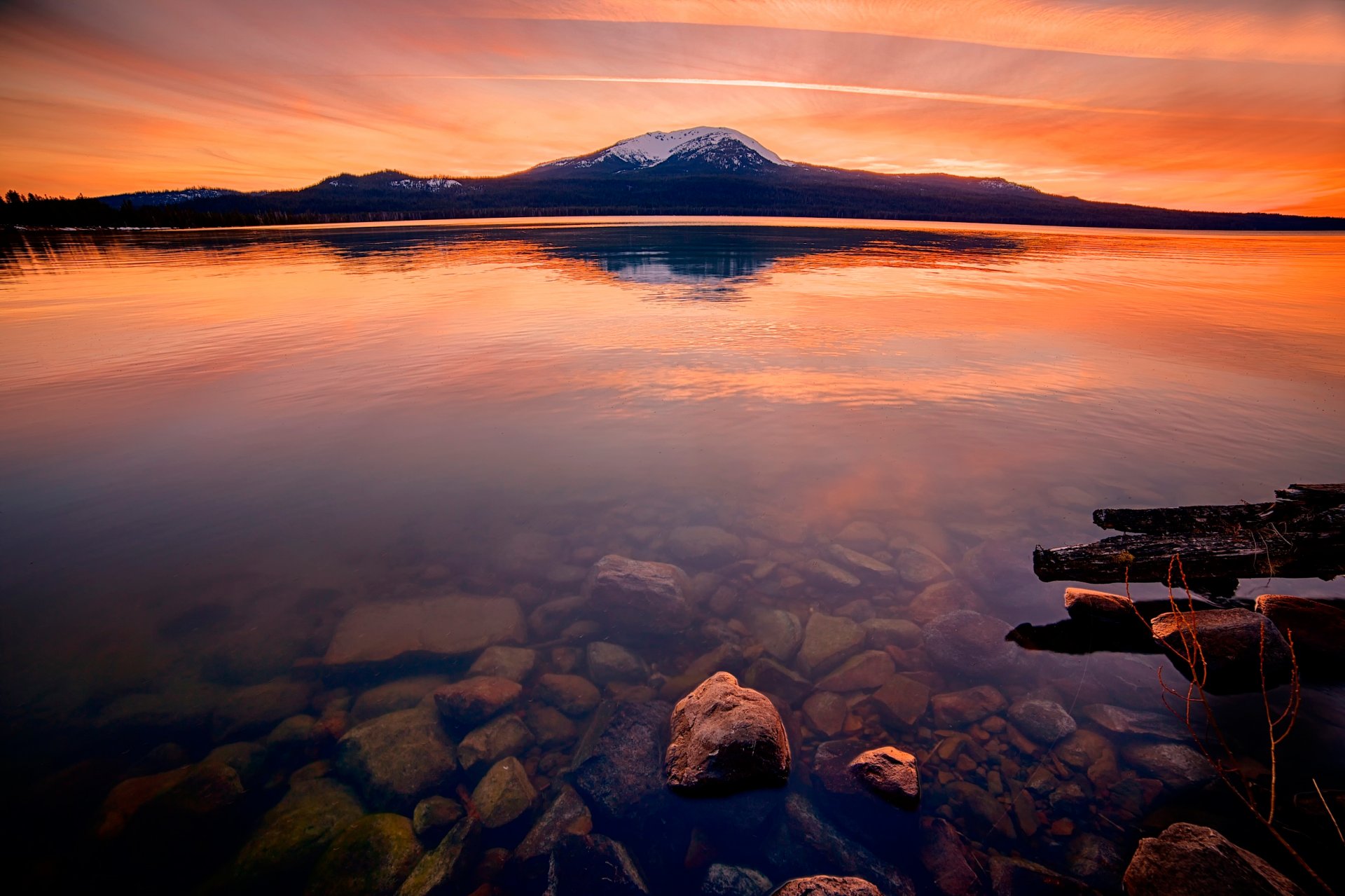 Coucher de soleil sur un lac de montagne transparent