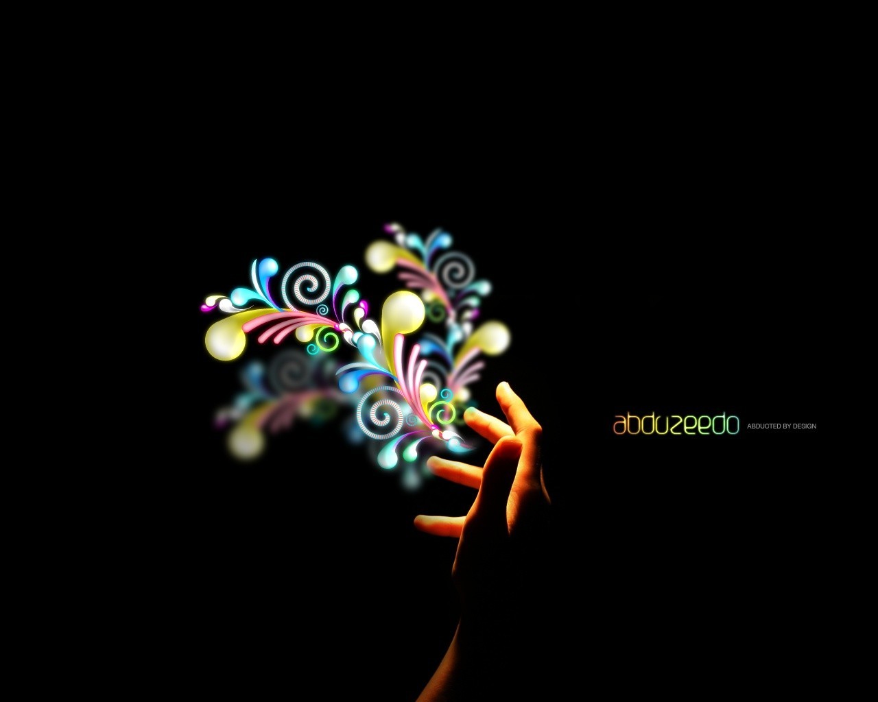 Image main touche un motif de couleur sur fond noirImage main touche un motif de couleur sur fond noir