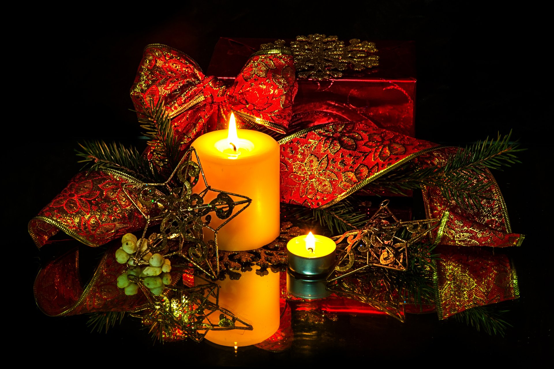 Arbre de Noël enneigé sur fond d'eau et coucher de soleil rouge