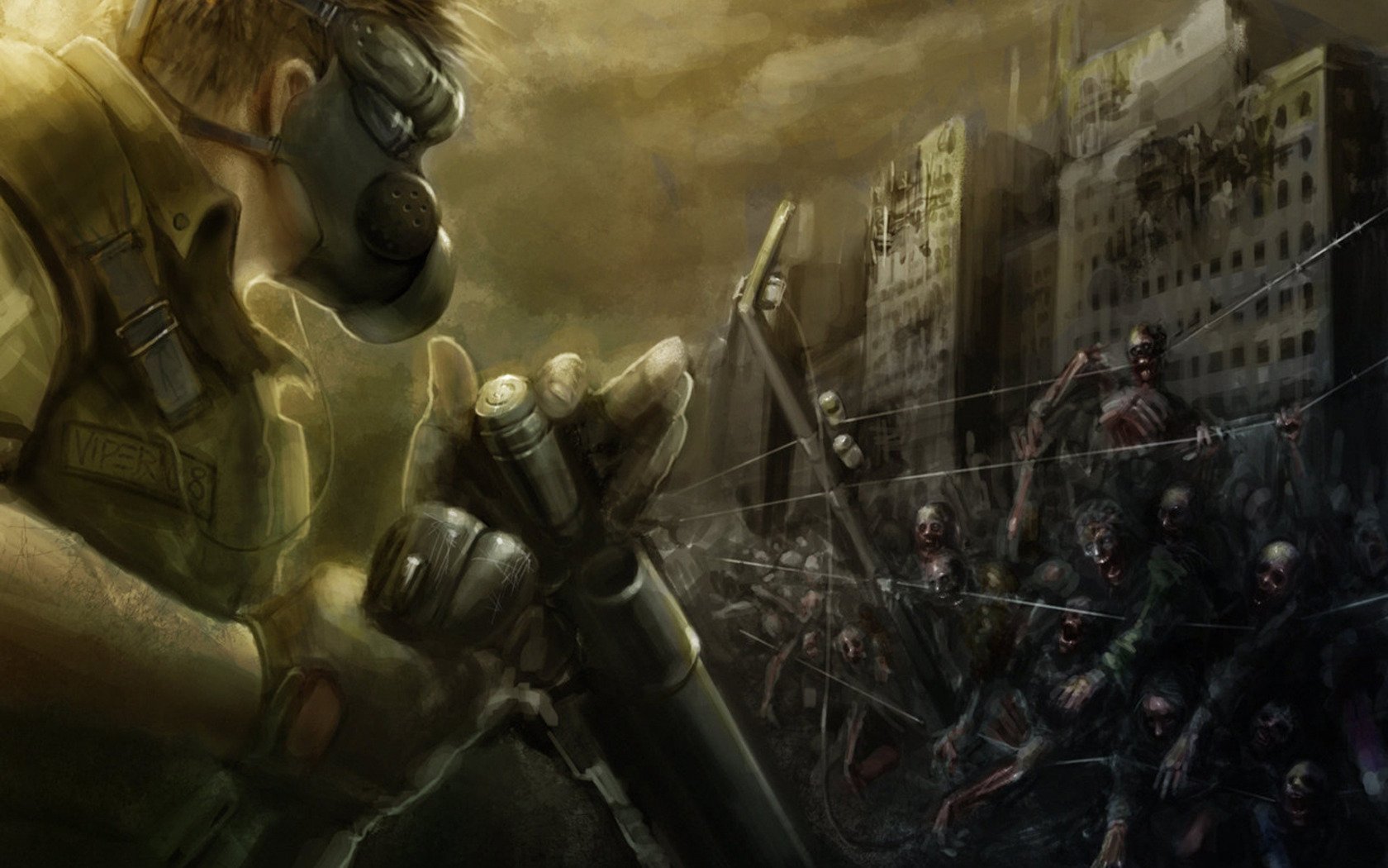 Un soldat dans un masque à gaz et dans un gilet pare-balles va traverser des barbelés