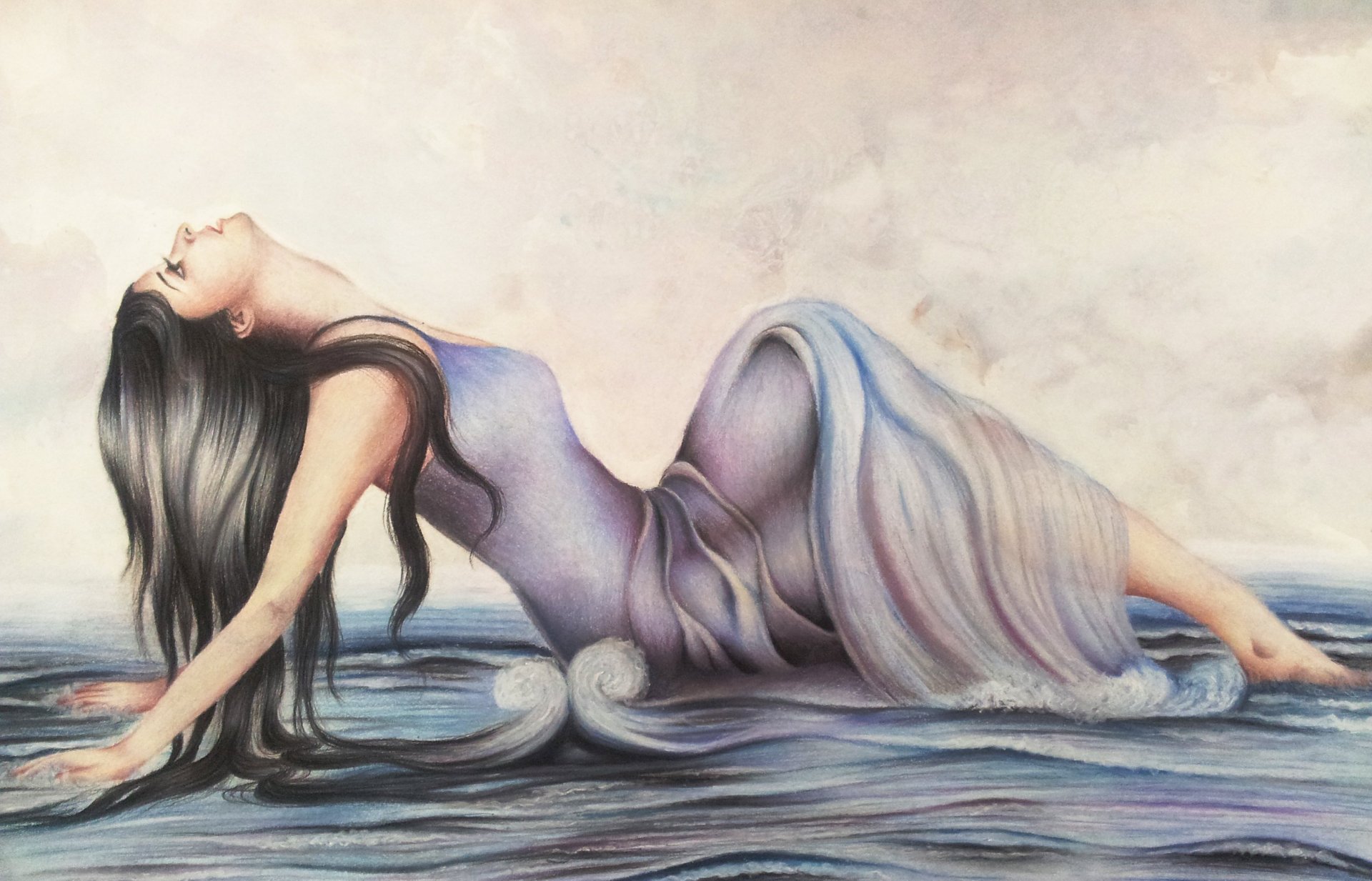 Sur le fond de la surface de l'eau et le ciel de l'aube peine à nous le dos de la jeune fille dans une robe sombre et au-dessus d'elle gravitent des corbeauxSur le fond de la surface de l'eau et le ciel de l'aube peine à nous le dos de la jeune fille dans une robe sombre et au-dessus d'elle gravitent des corbeaux