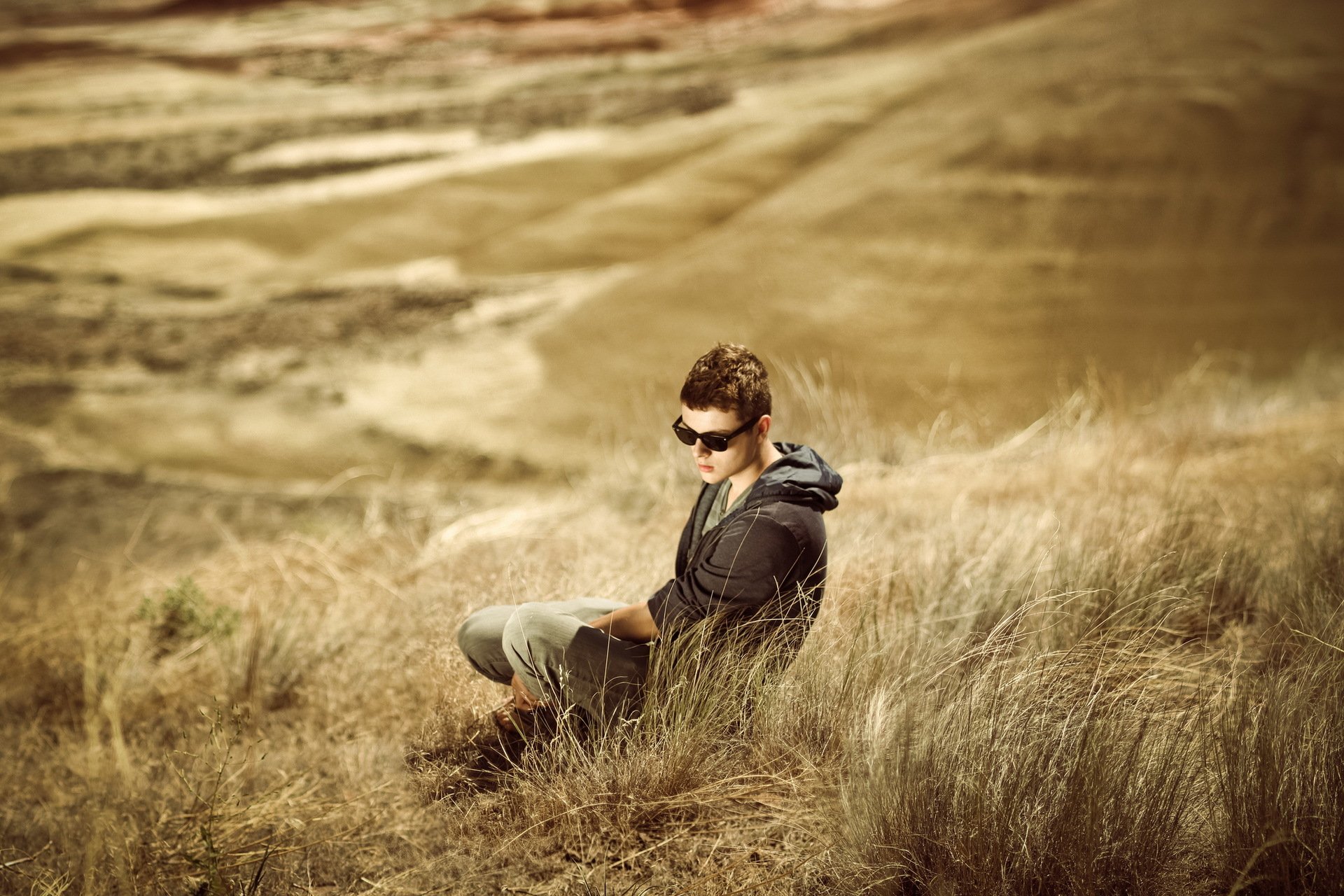 Fille avec une guitare assis au milieu de la routeFille avec une guitare assis au milieu de la route
