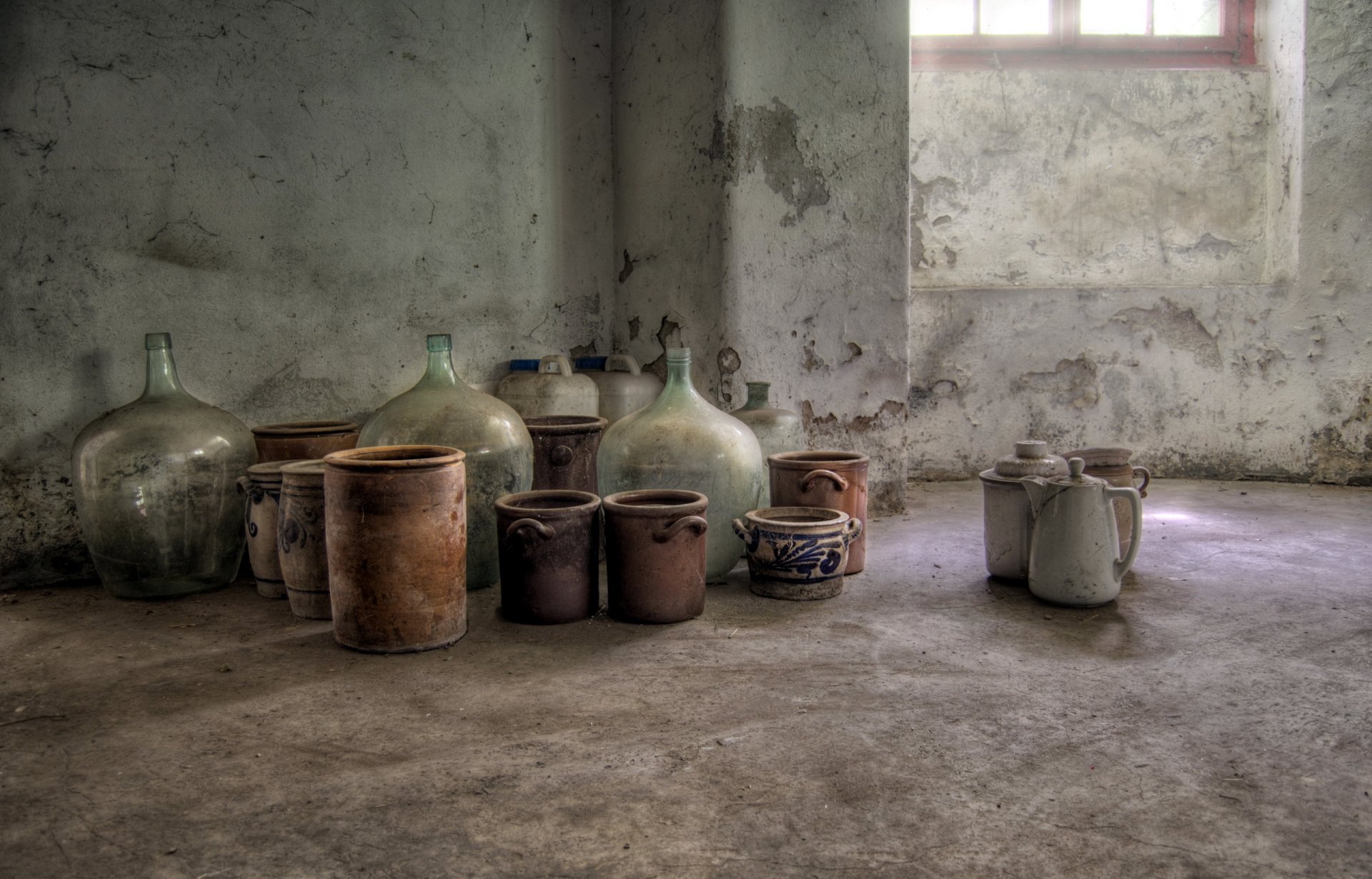 Chambre avec de grandes bouteilles et de la vaisselle en céramiqueChambre avec de grandes bouteilles et de la vaisselle en céramique