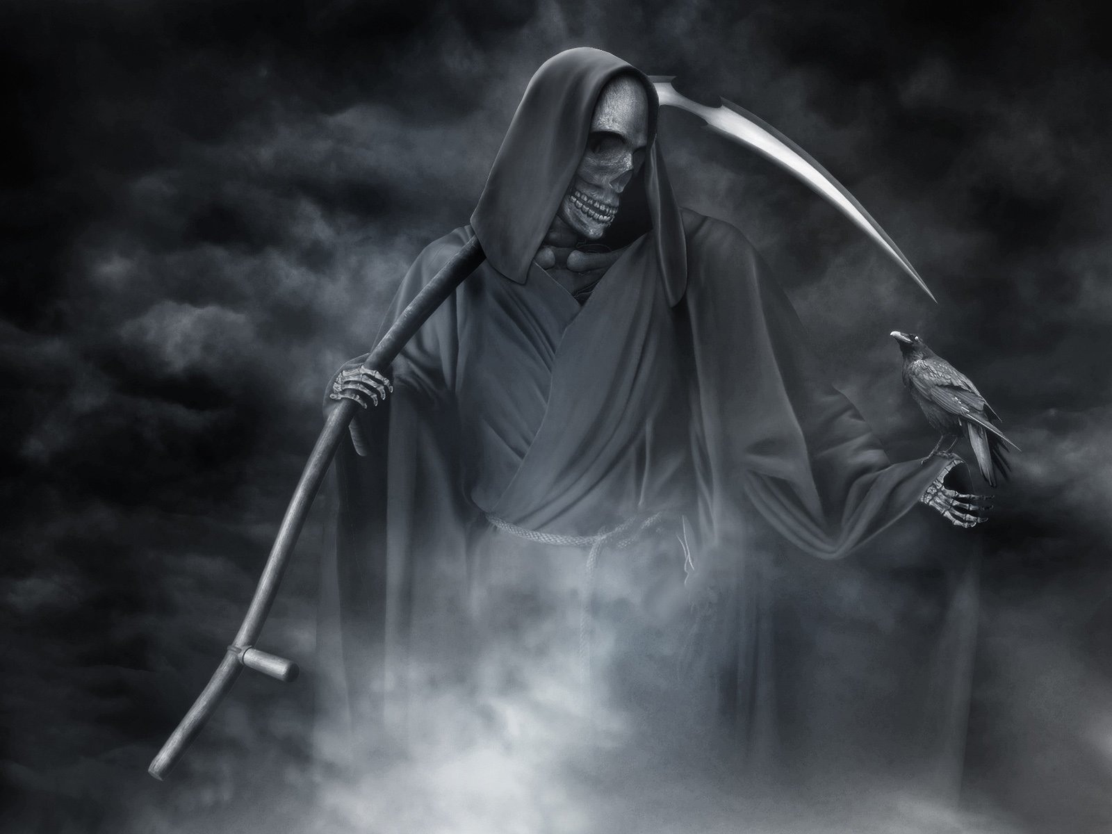 La mort avec une tresse et une lanterne se tient dans le noirLa mort avec une tresse et une lanterne se tient dans le noir