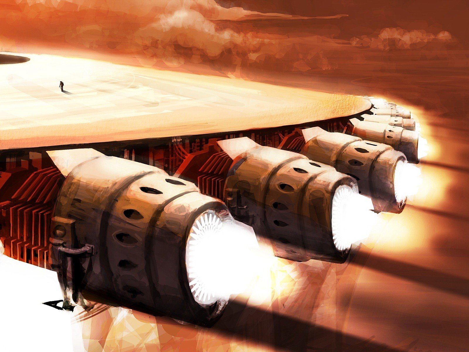 Dessin de turbines hyperréactives sous l'aile d'un objet volantDessin de turbines hyperréactives sous l'aile d'un objet volant