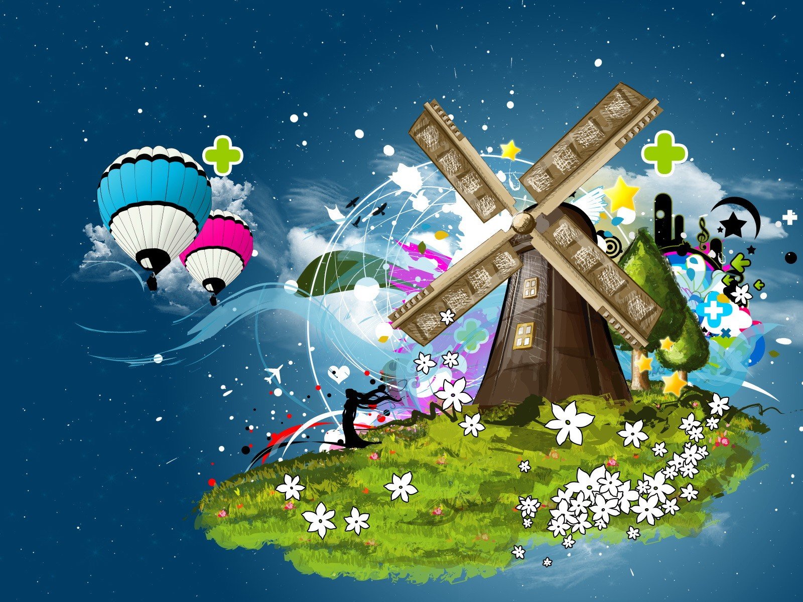 Collage de moulin avec des fleurs et des boules de couleurCollage de moulin avec des fleurs et des boules de couleur