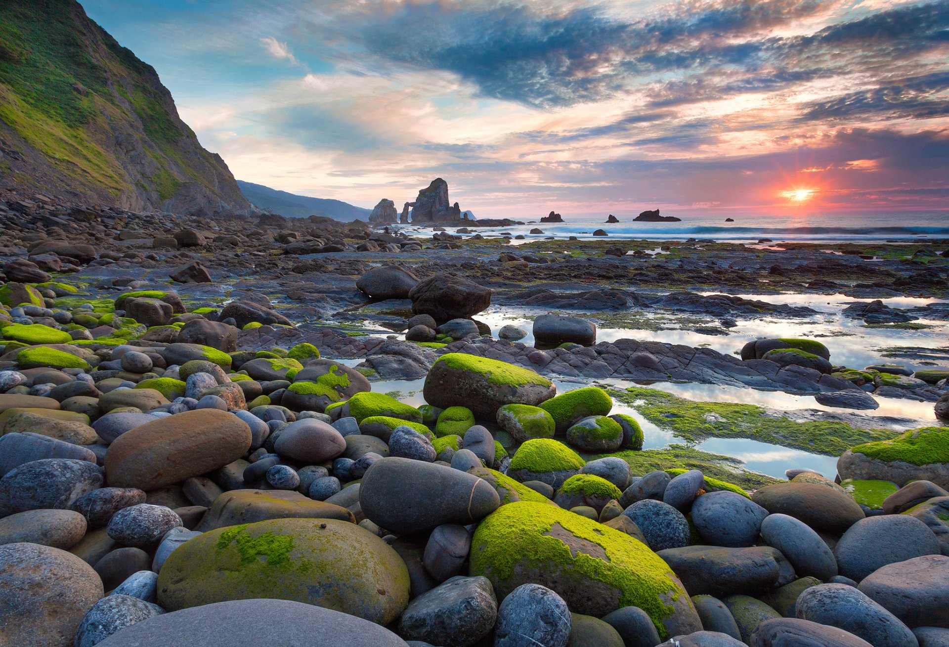 Soleil dans le ciel au-dessus de l'eau avec des pierres et de la mousseSoleil dans le ciel au-dessus de l'eau avec des pierres et de la mousse