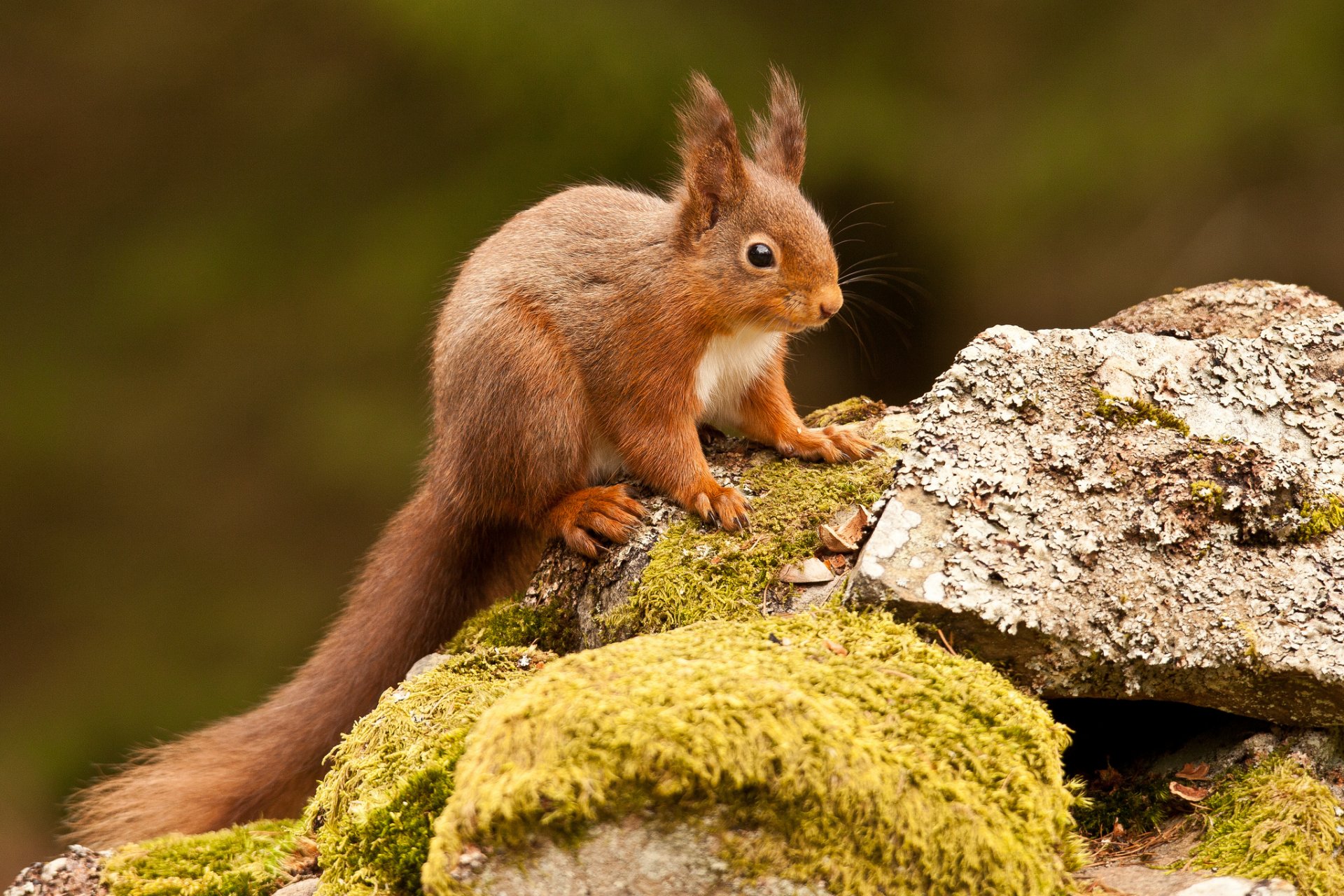 Écureuil roux est assis sur des pierres recouvertes de mousse et mange