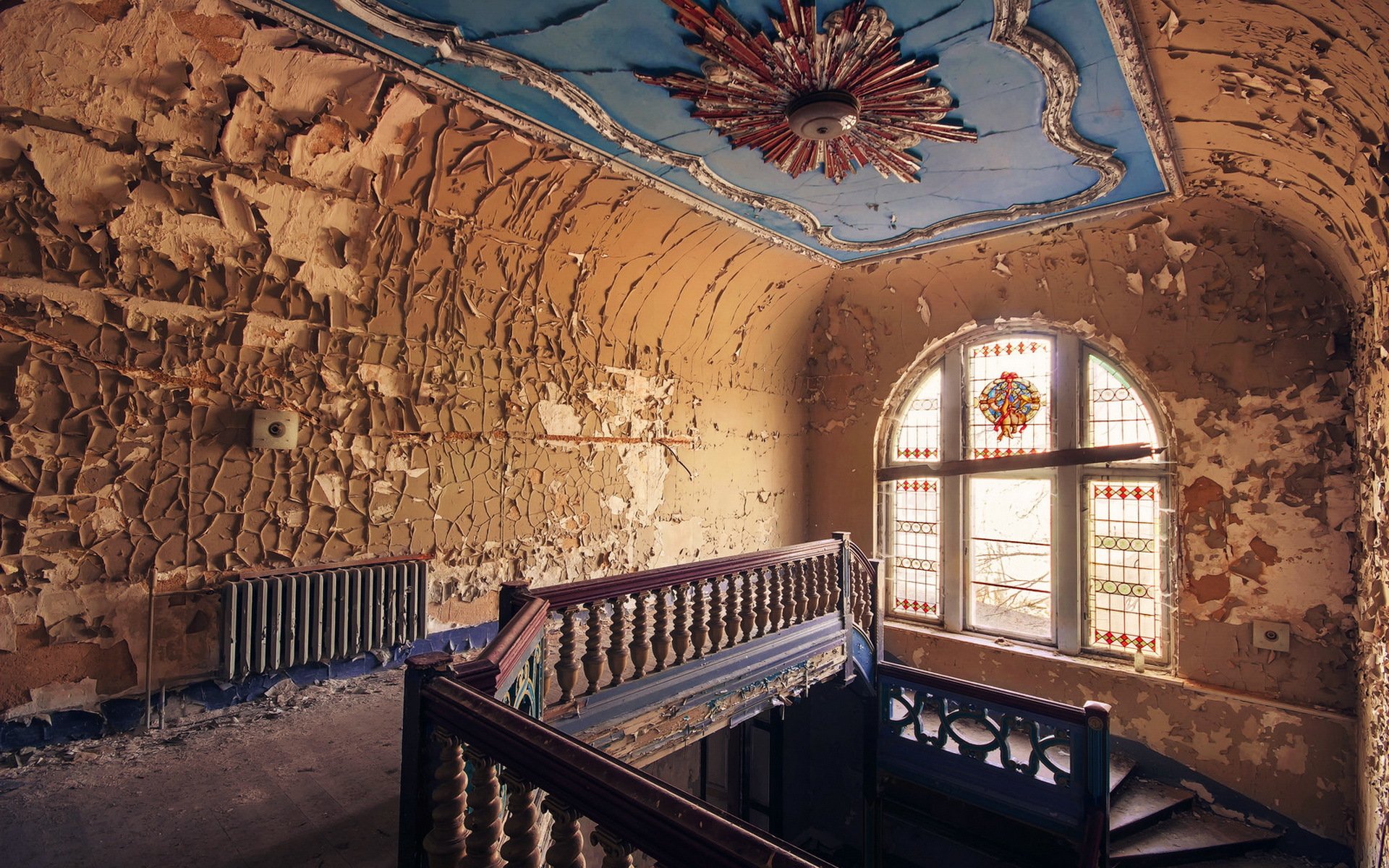 Salle de classe vide avec armoires vides, planchers et murs déchirés