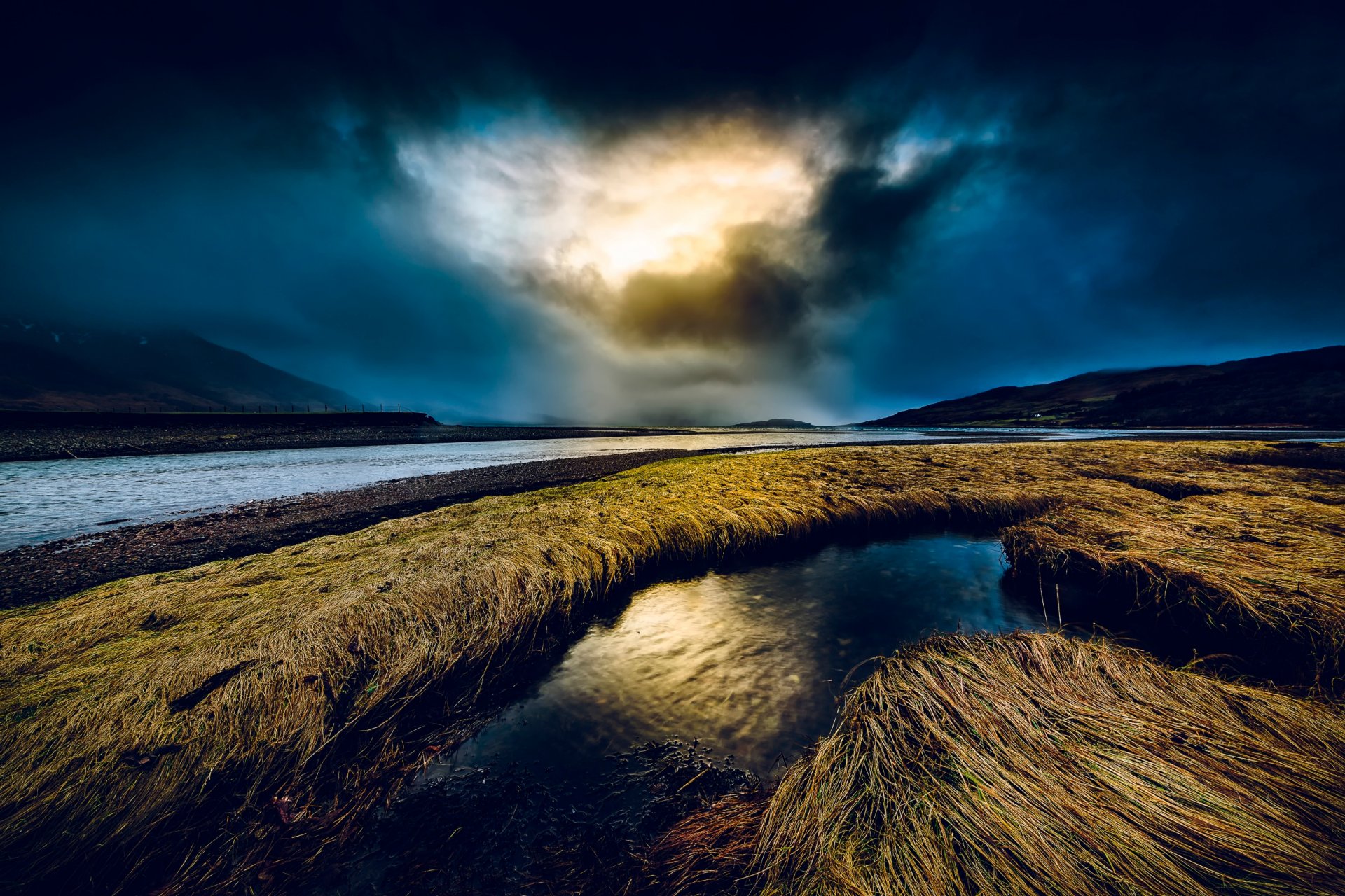 Coucher de soleil dans les montagnes à travers le paysage de nuages