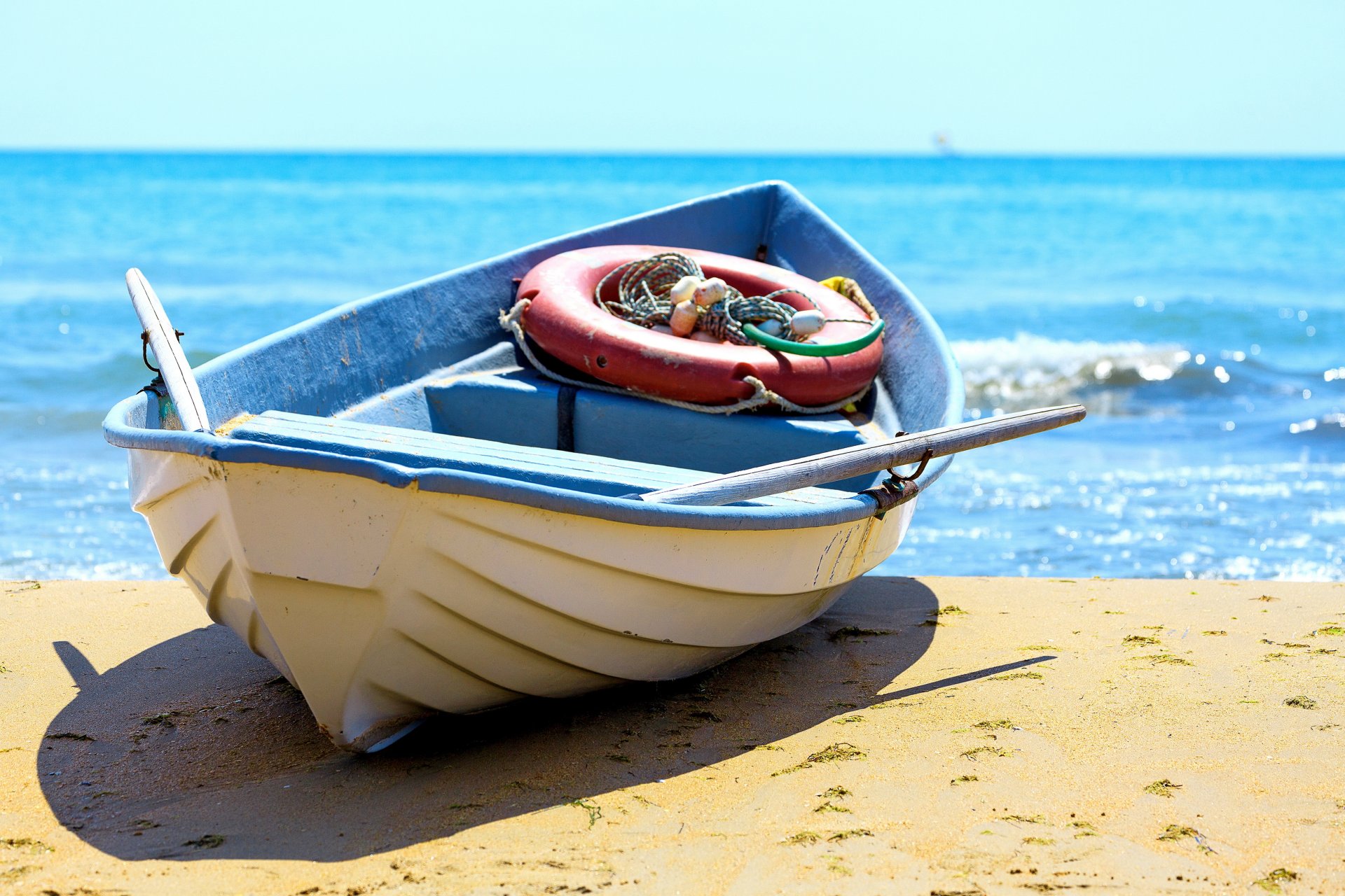 Bateau sur le rivage. Plage propre. Cuillère bleue