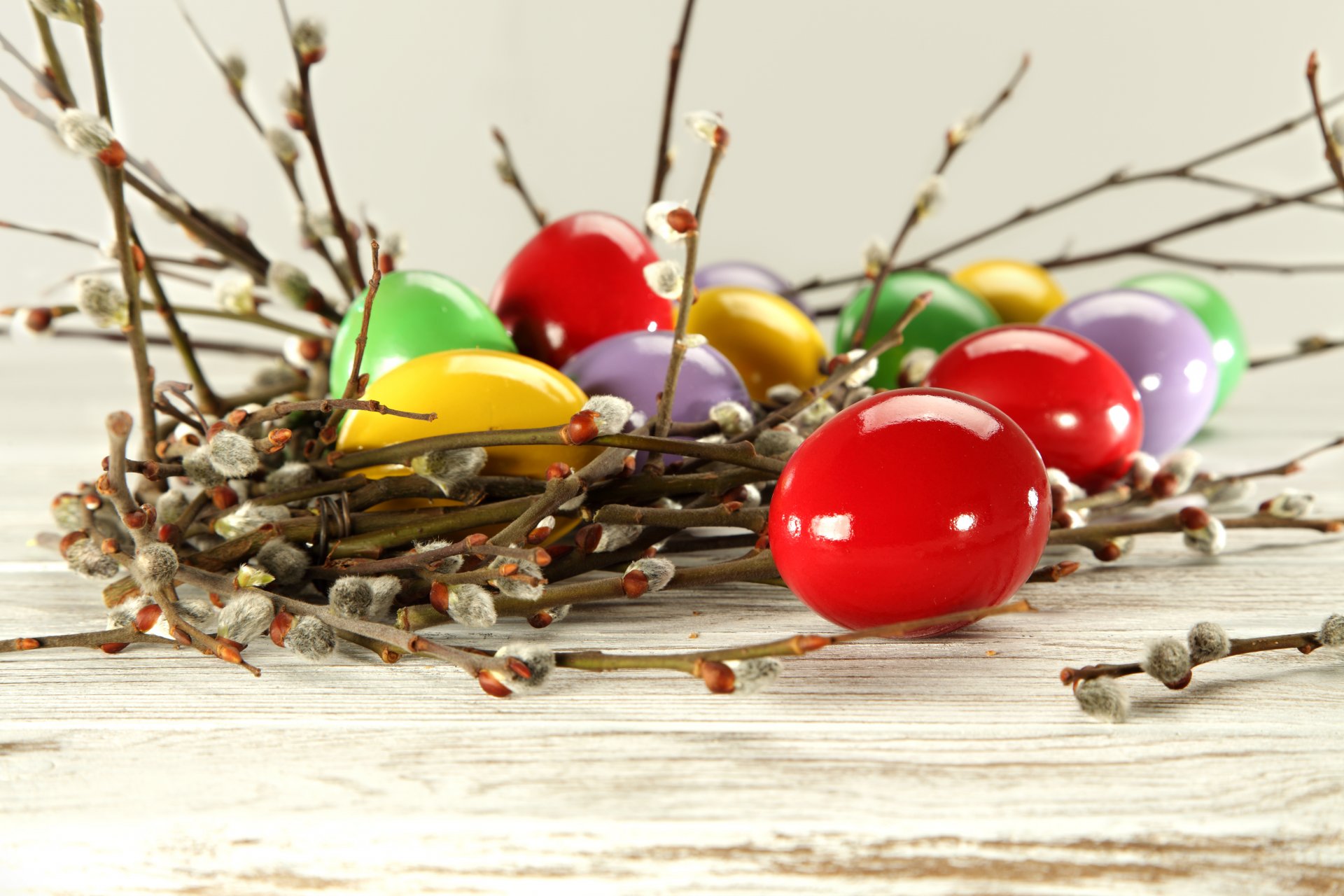 Oeufs de Pâques sur la table avec des rubans et des fleurs