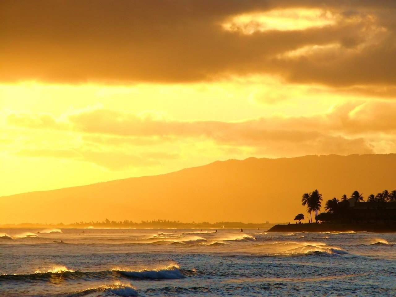 Vagues de l'océan au coucher du soleil avec des palmiersVagues de l'océan au coucher du soleil avec des palmiers