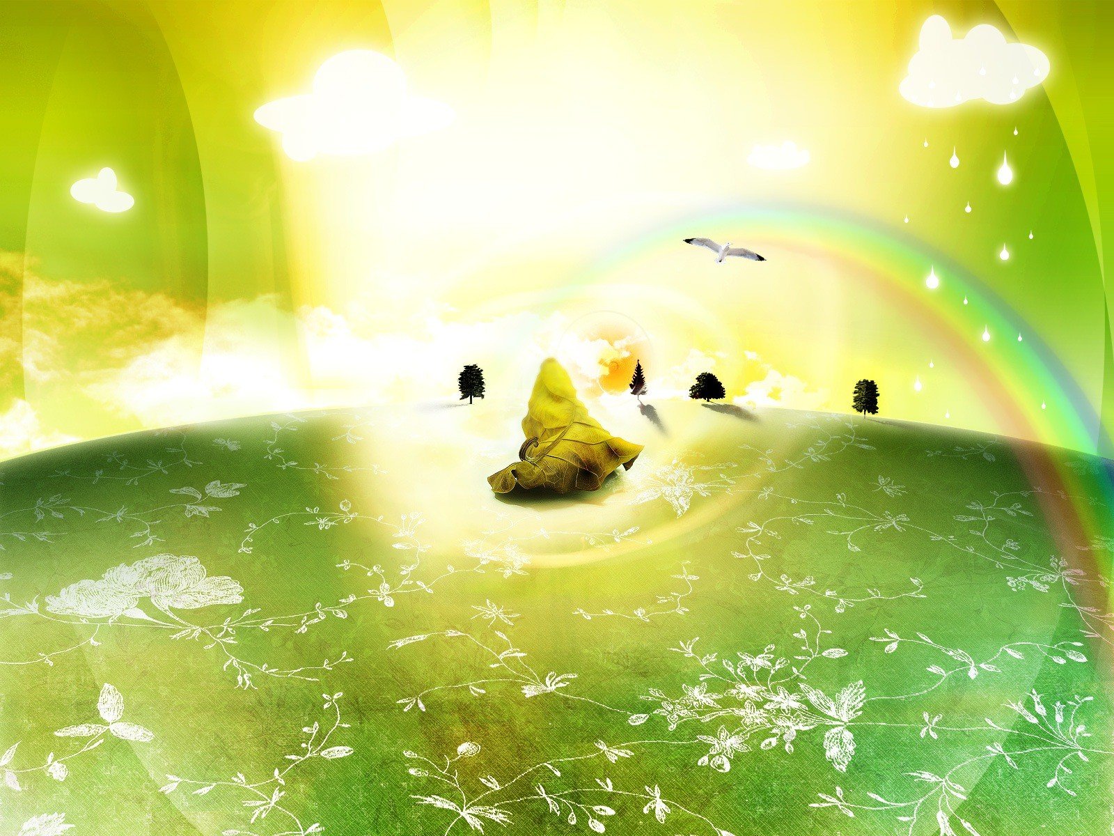 Fond d'écran avec monde vert, arc-en-ciel et oiseau