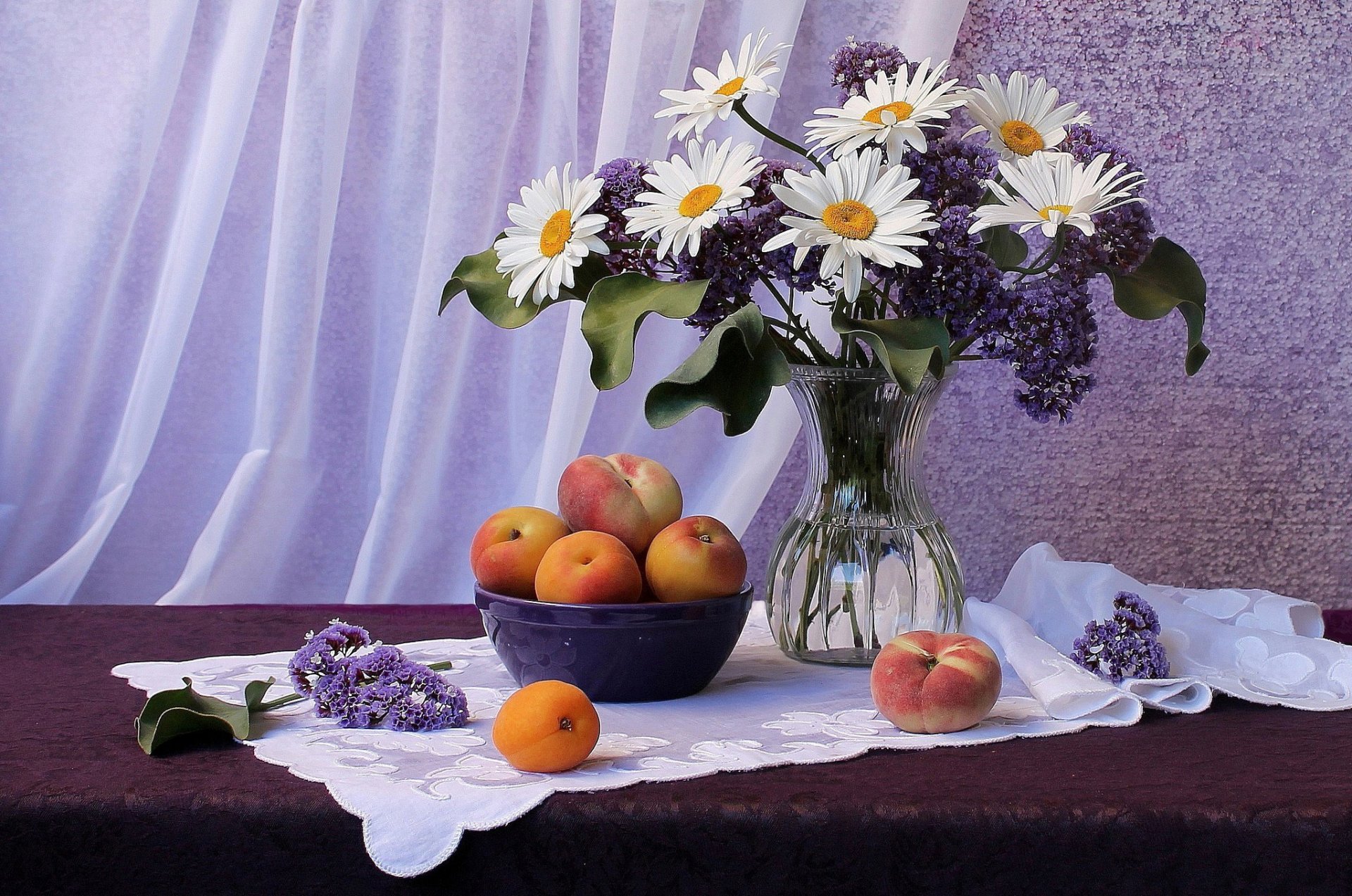 Peinture avec des pêches et un bouquet de marguerites avec lilas
