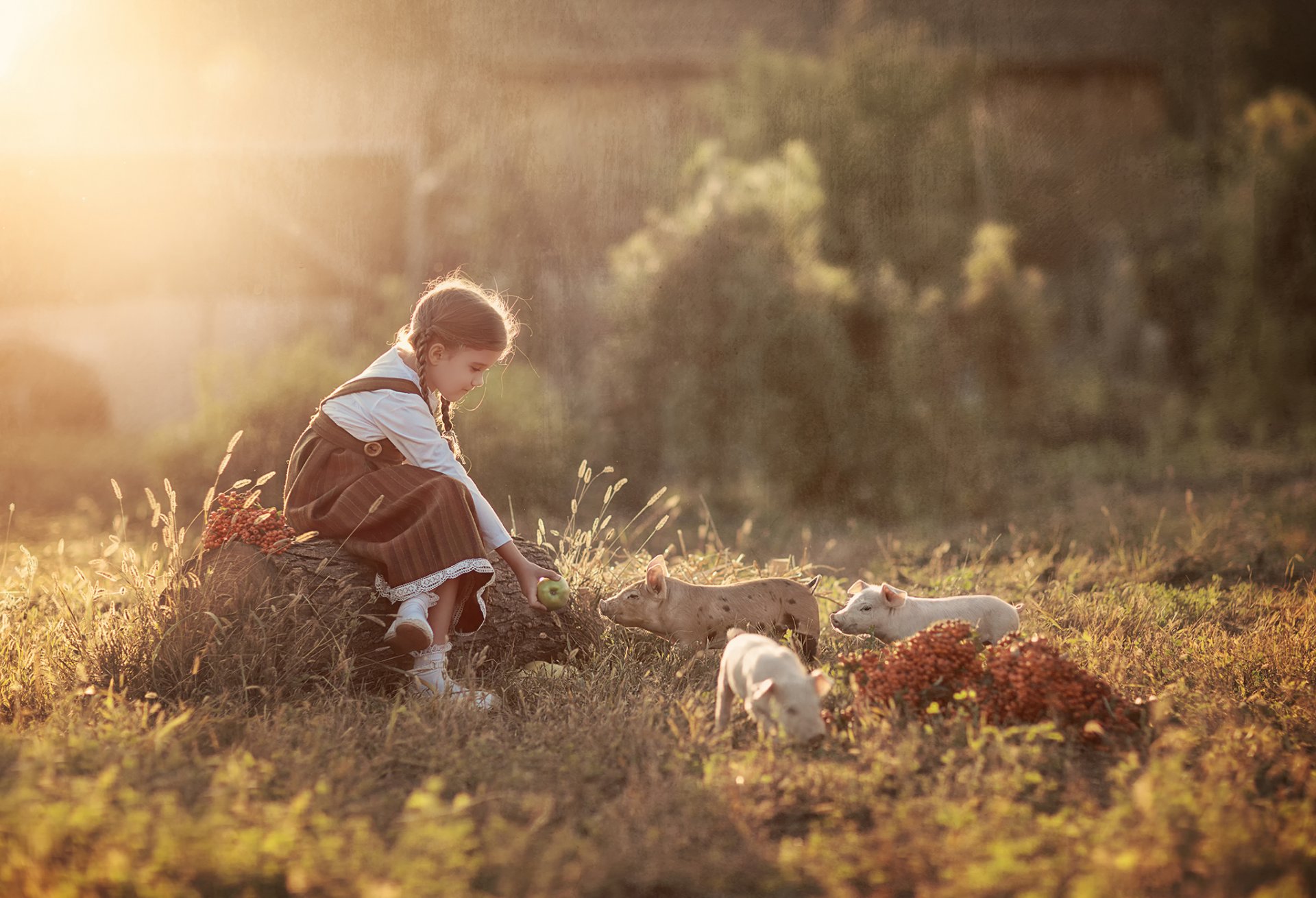 La petite fille dans la prairie nourrit porcelets la pommeLa petite fille dans la prairie nourrit porcelets la pomme