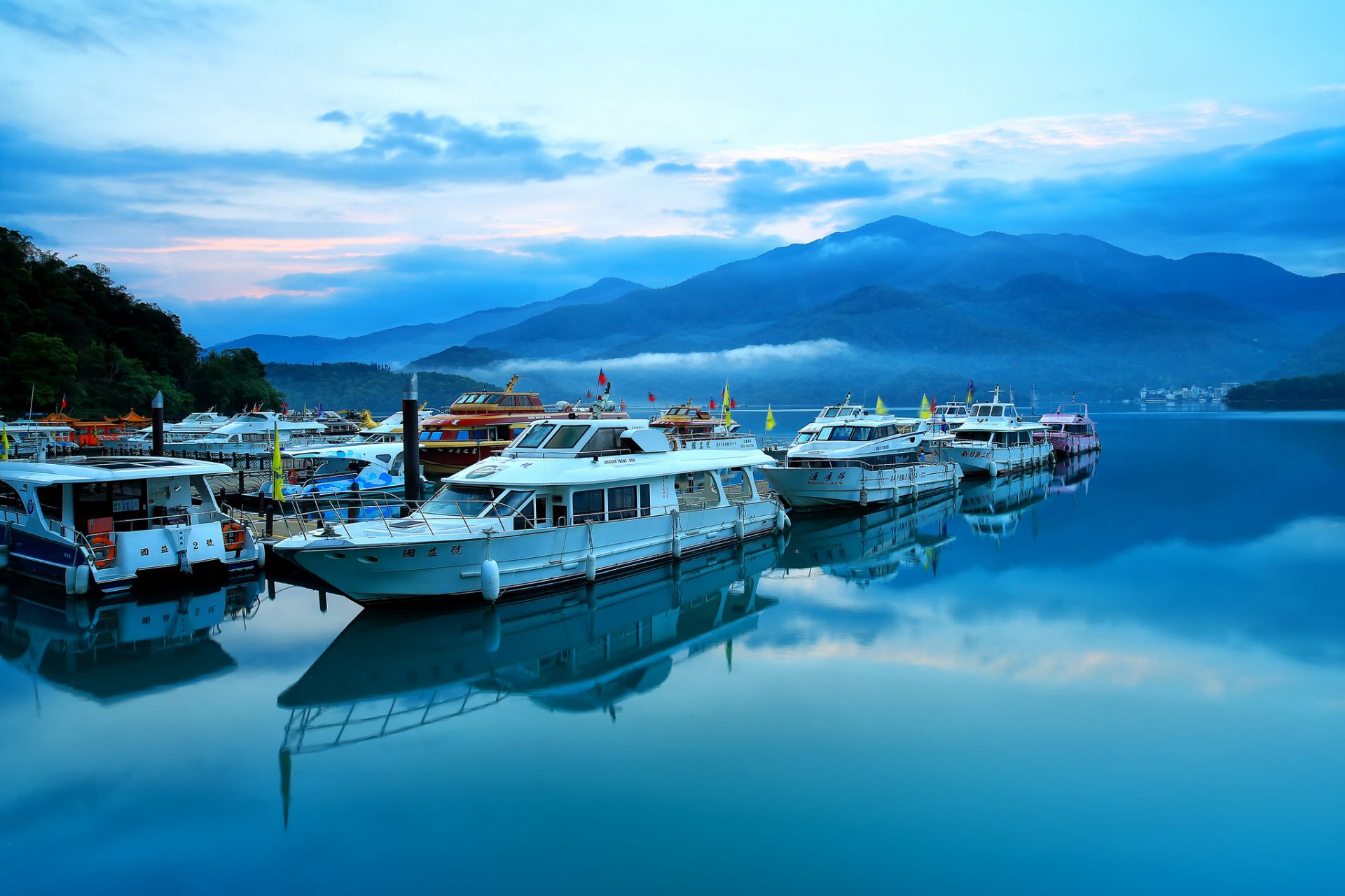 Quai avec des bateaux et des bateaux sur fond de montagnesQuai avec des bateaux et des bateaux sur fond de montagnes
