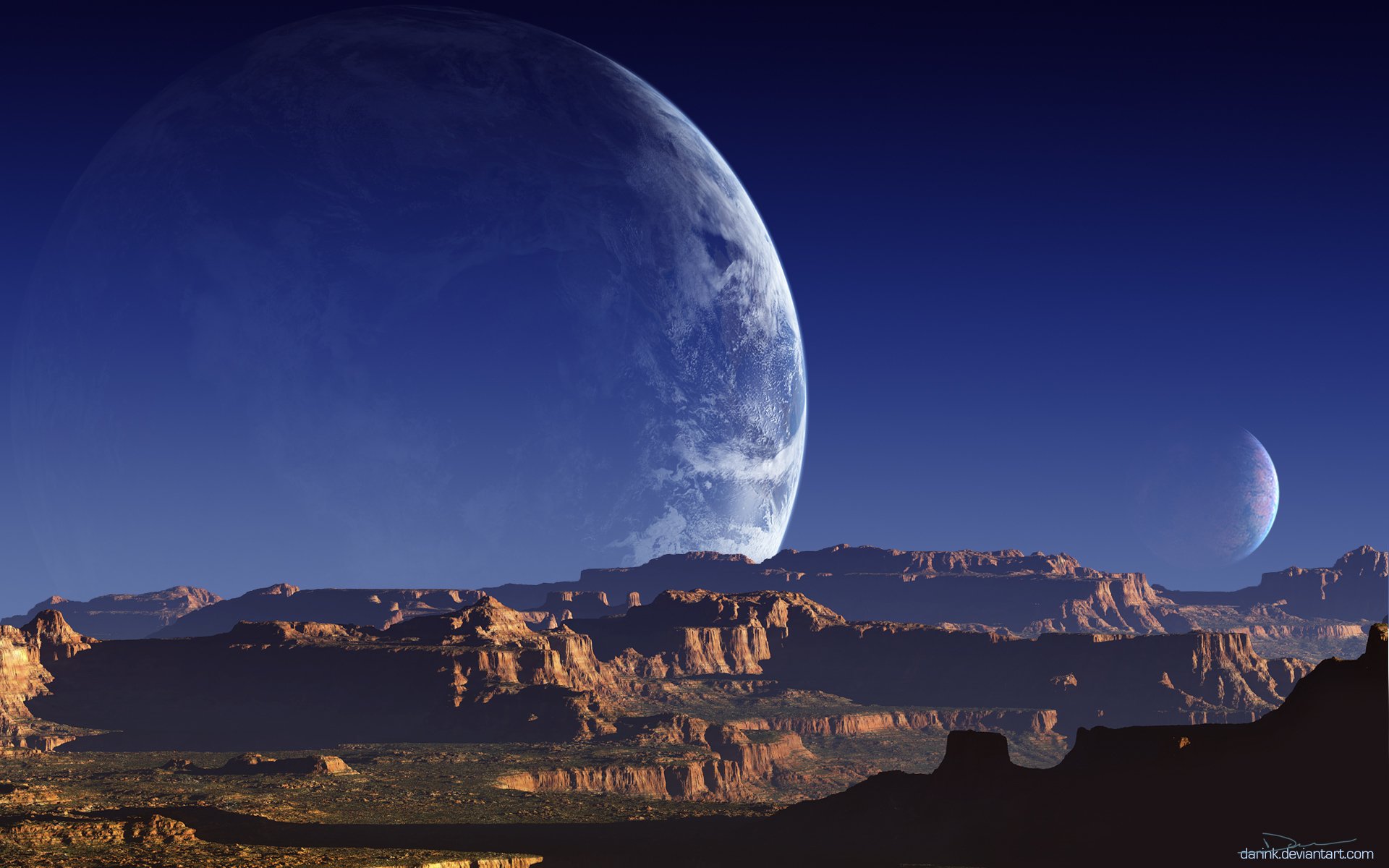 La planète bleue et son satellite dans la lumière tamisée de la nébuleuseLa planète bleue et son satellite dans la lumière tamisée de la nébuleuse
