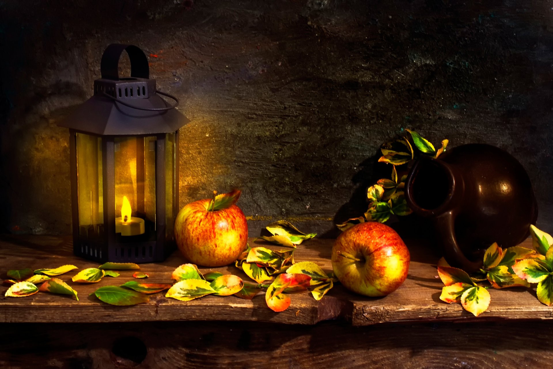 Les pommes sont réchauffées par la lueur d'une lanterne près d'une crucheLes pommes sont réchauffées par la lueur d'une lanterne près d'une cruche