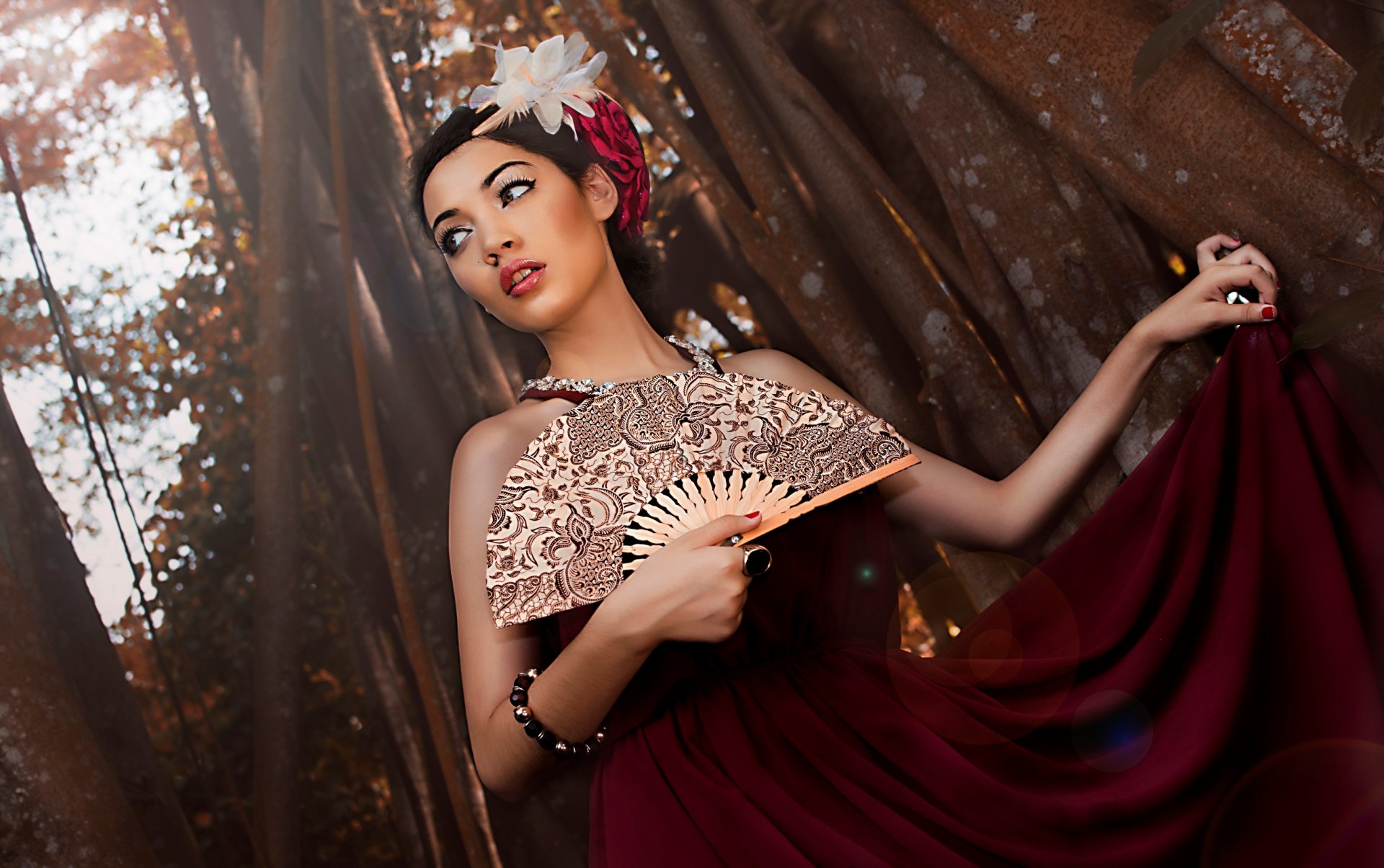 Port reth fille dans une robe rouge foncé avec un ventilateur à la mainPort reth fille dans une robe rouge foncé avec un ventilateur à la main
