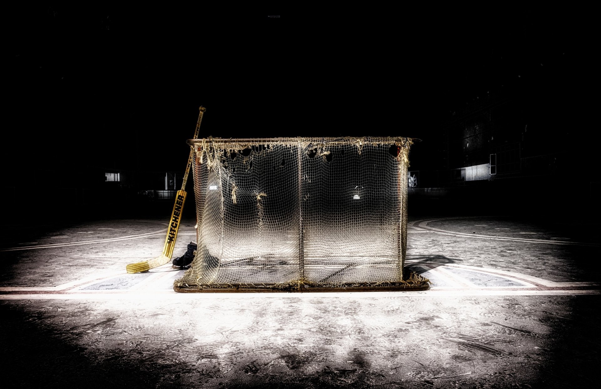 Champ vert brumeux, au premier plan de la porte de sport et de l'arbreChamp vert brumeux, au premier plan de la porte de sport et de l'arbre