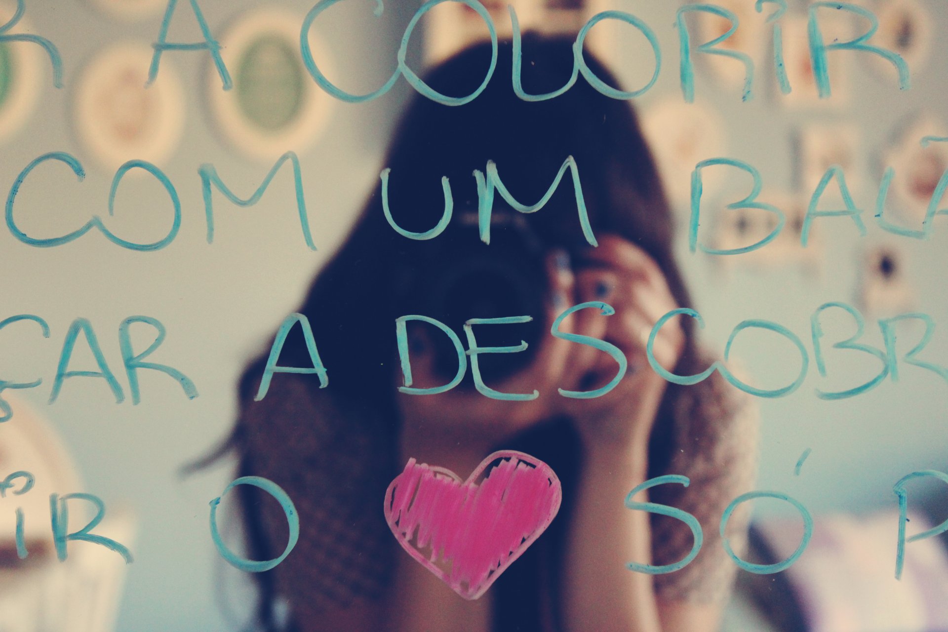 Jeune fille brune prend des photos d'elle-même dans le miroir, écrit par une déclaration d'amour