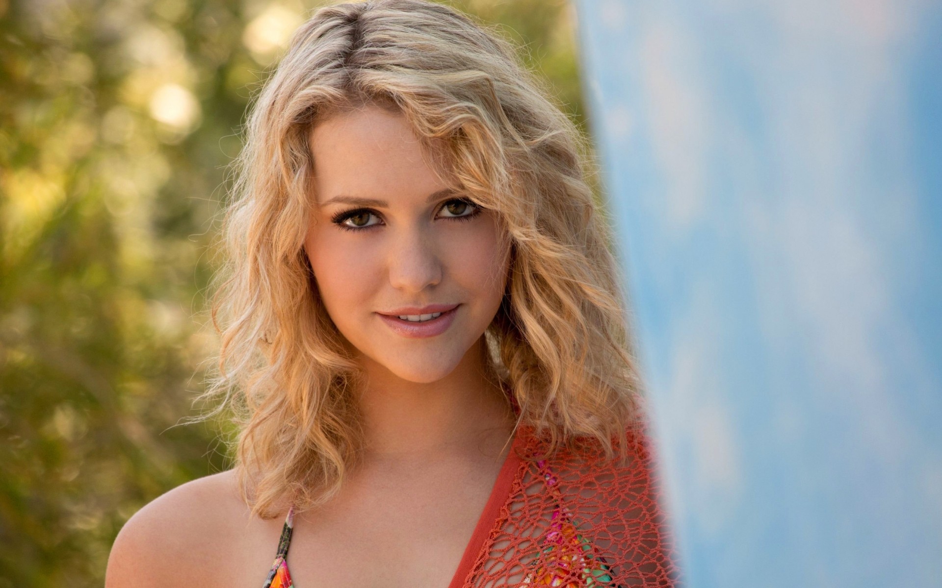 Blonde sur fond de verdure. Sourire