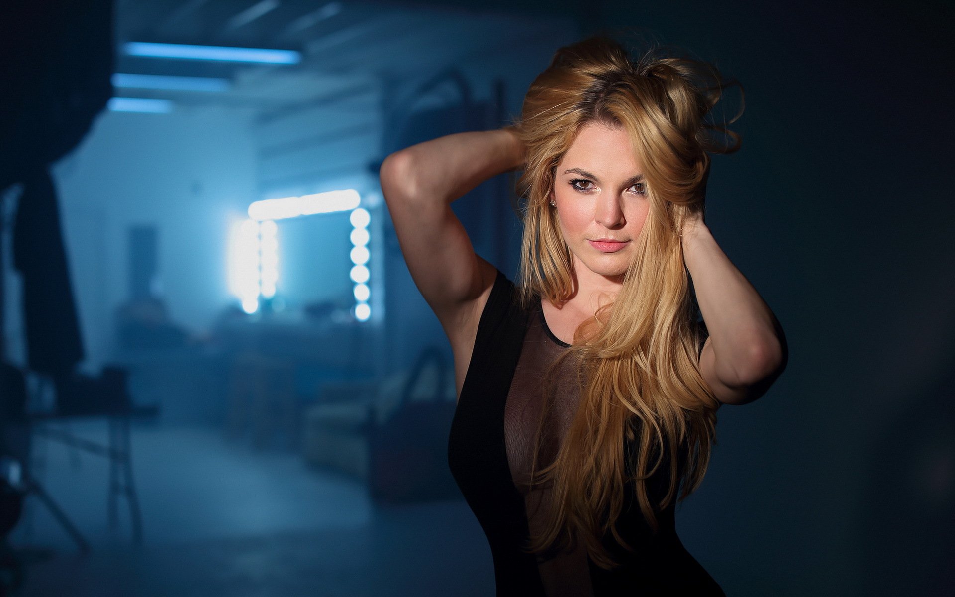 Brunette en sandales et robe noire sur le canapé blancBrunette en sandales et robe noire sur le canapé blanc