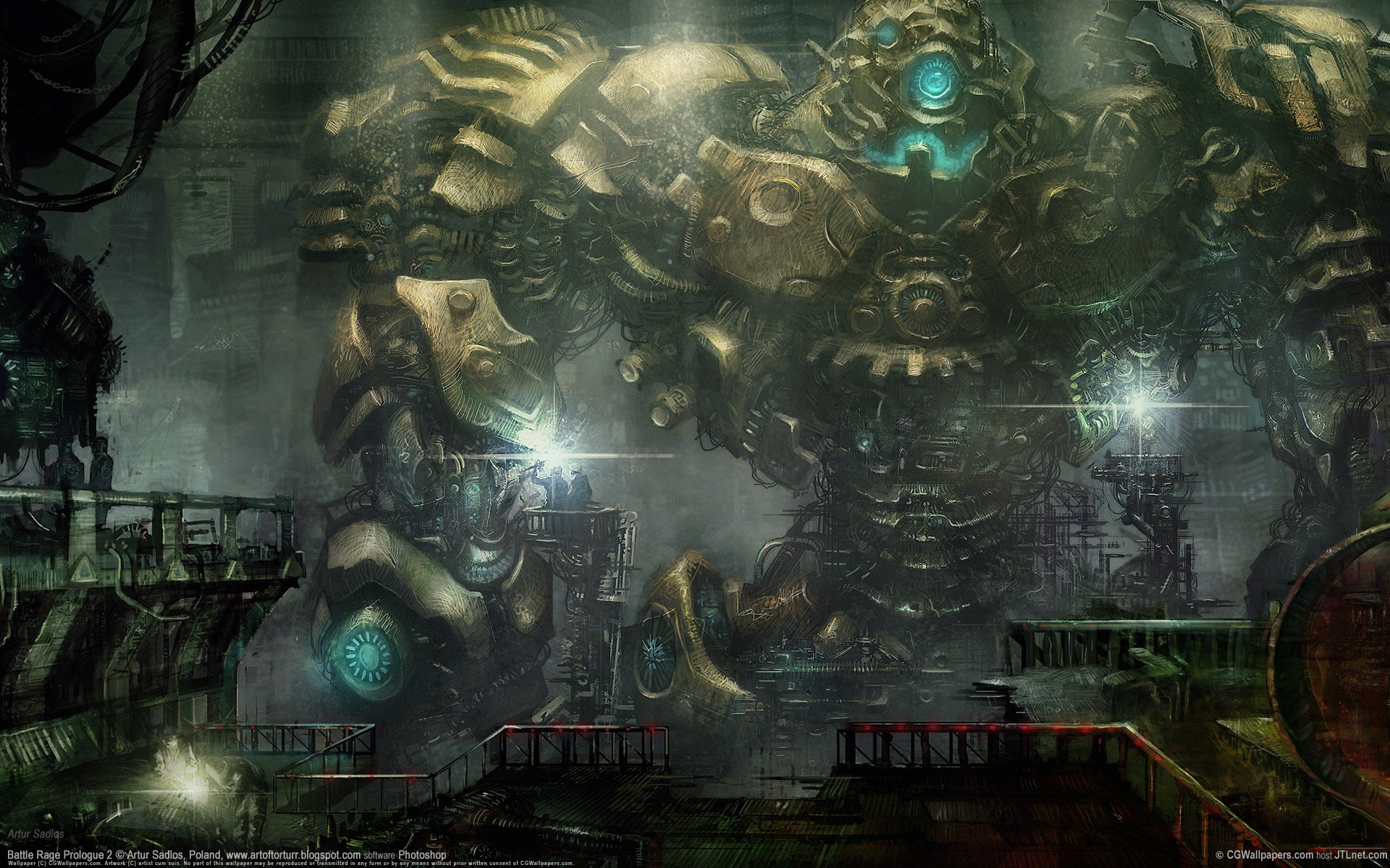 Cyborg avec l'épée dans la bataille. La révolte des machines