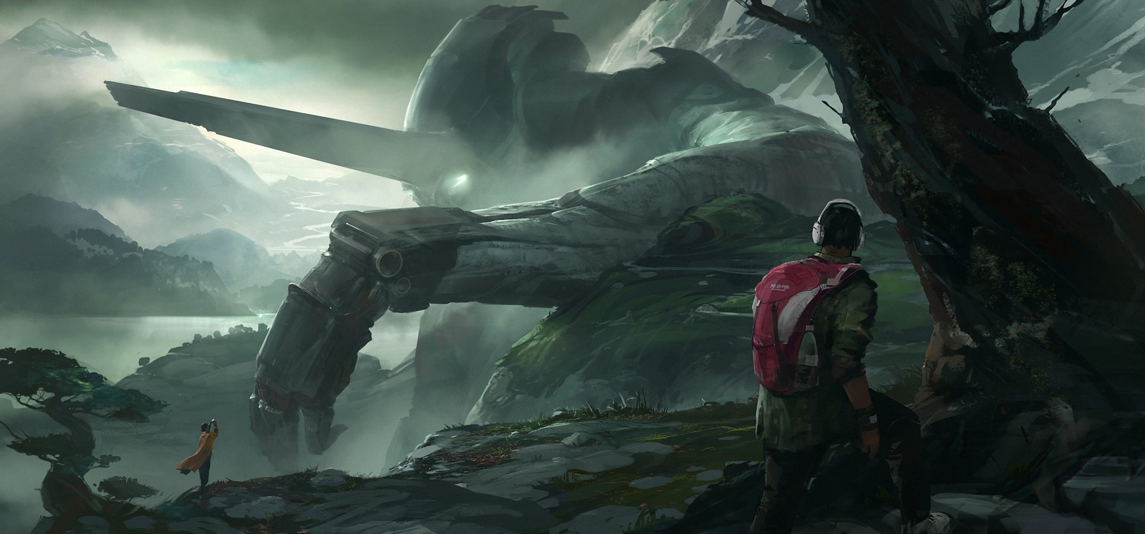 Mercenaires avec des armes aux yeux brillants parmi les colonnes