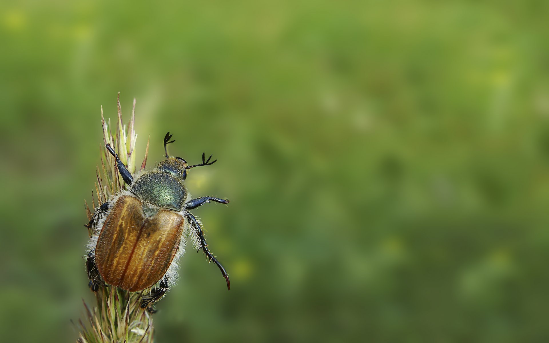 Un insecte vert brille sur l'herbe