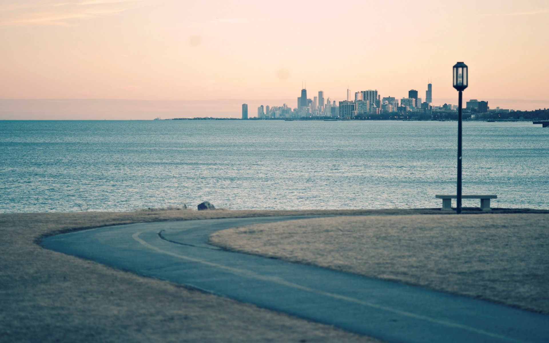 Route avec un banc sur le fond d'un plan d'eau avec des gratte-ciel