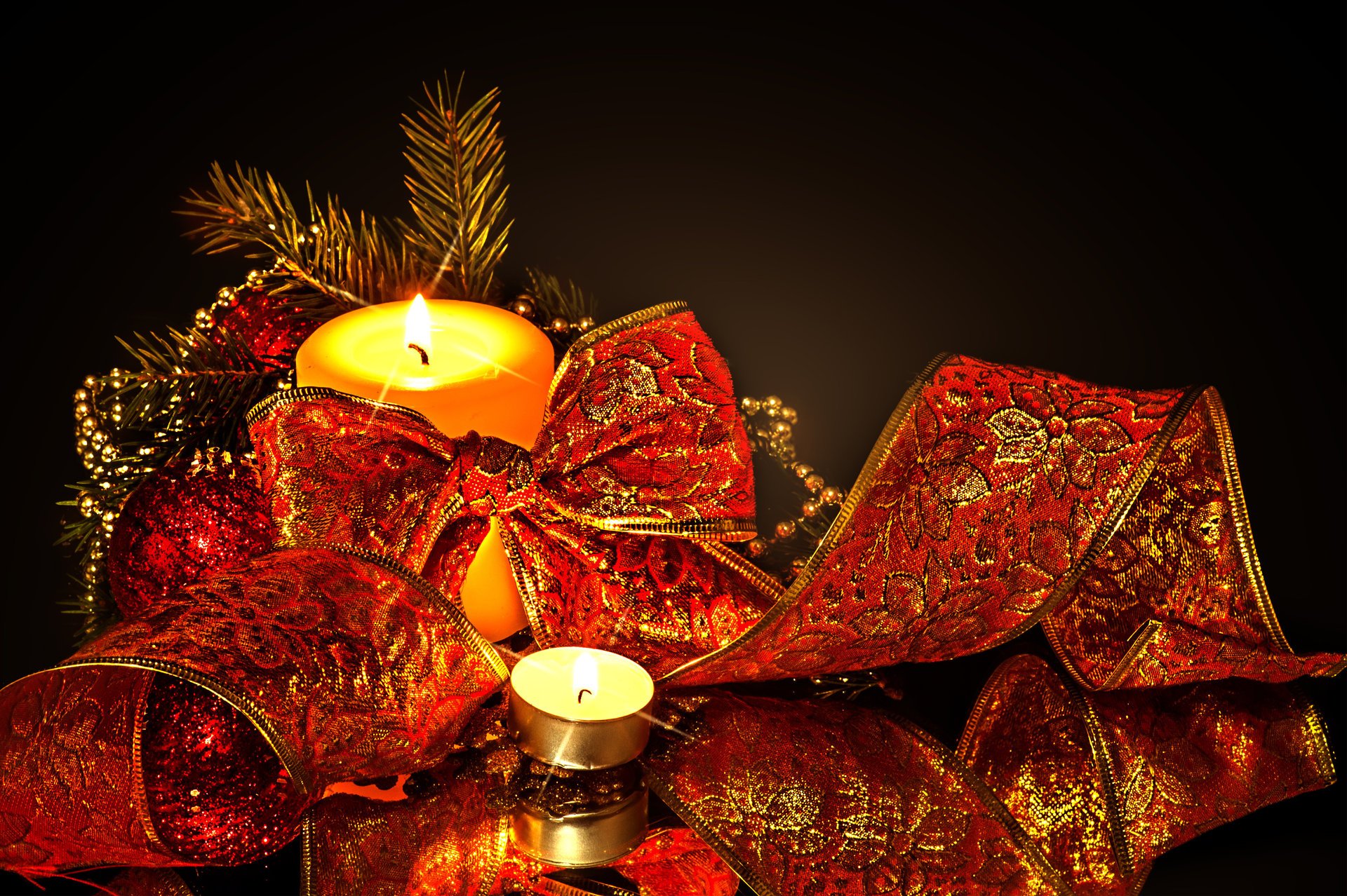 Décorations de noël sur fond de rubans et de bougiesDécorations de Noël sur fond de rubans et de bougies