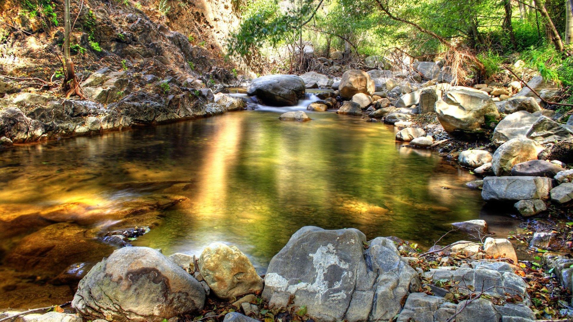 Ruisseau dans la forêt parmi les fougères et la verdureRuisseau dans la forêt parmi les fougères et la verdure