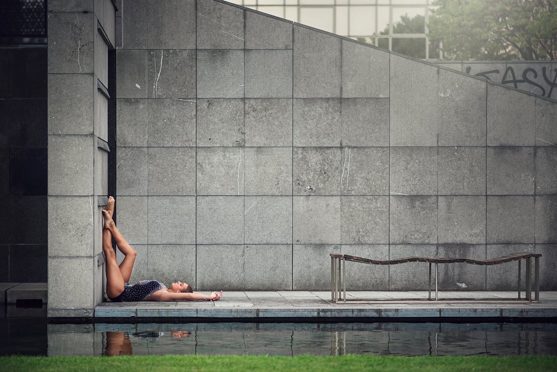 Jambes gracieuses d'une gymnaste près d'un mur gris