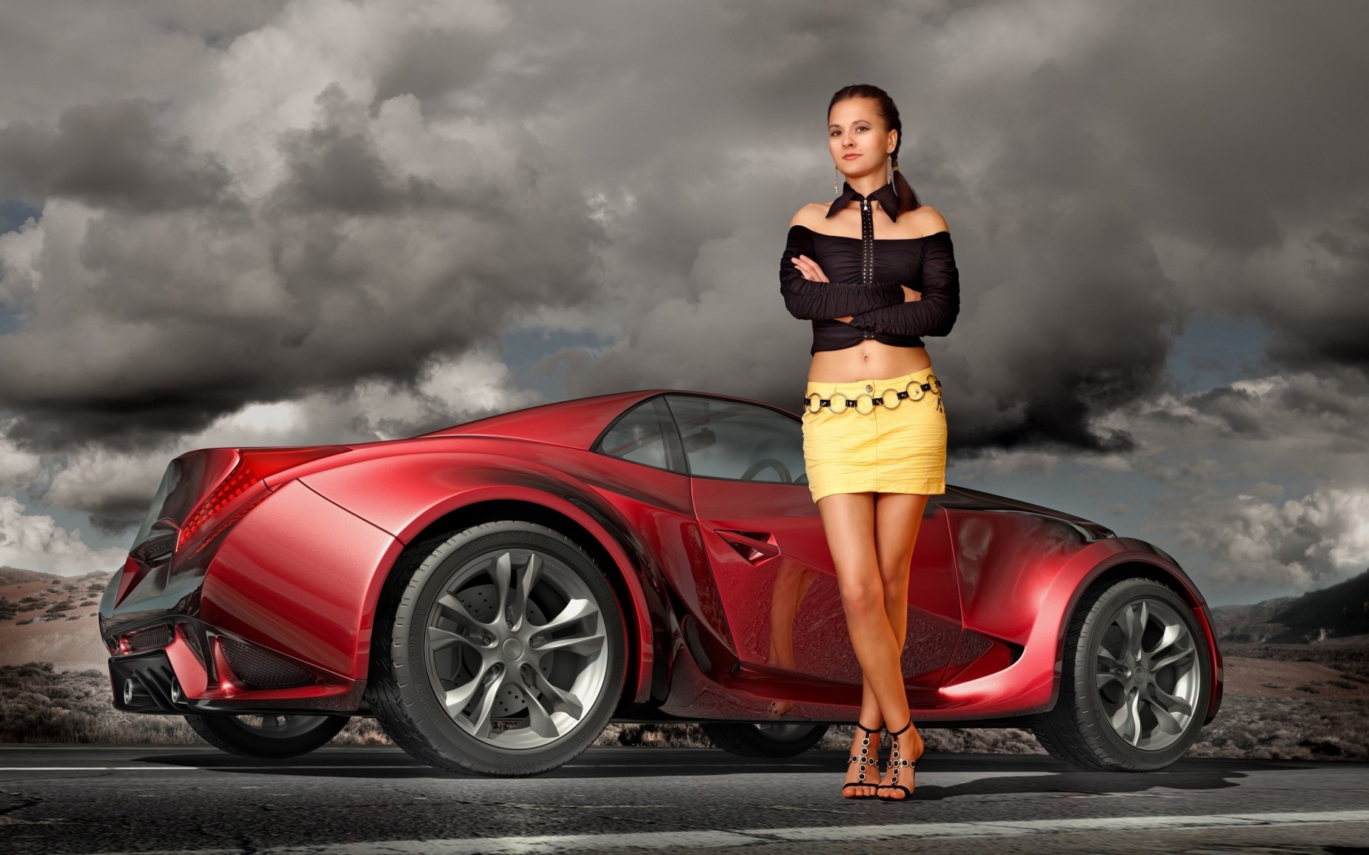 Fille en jupe jaune sur fond de voiture de sport rougeFille en jupe jaune sur fond de voiture de sport rouge