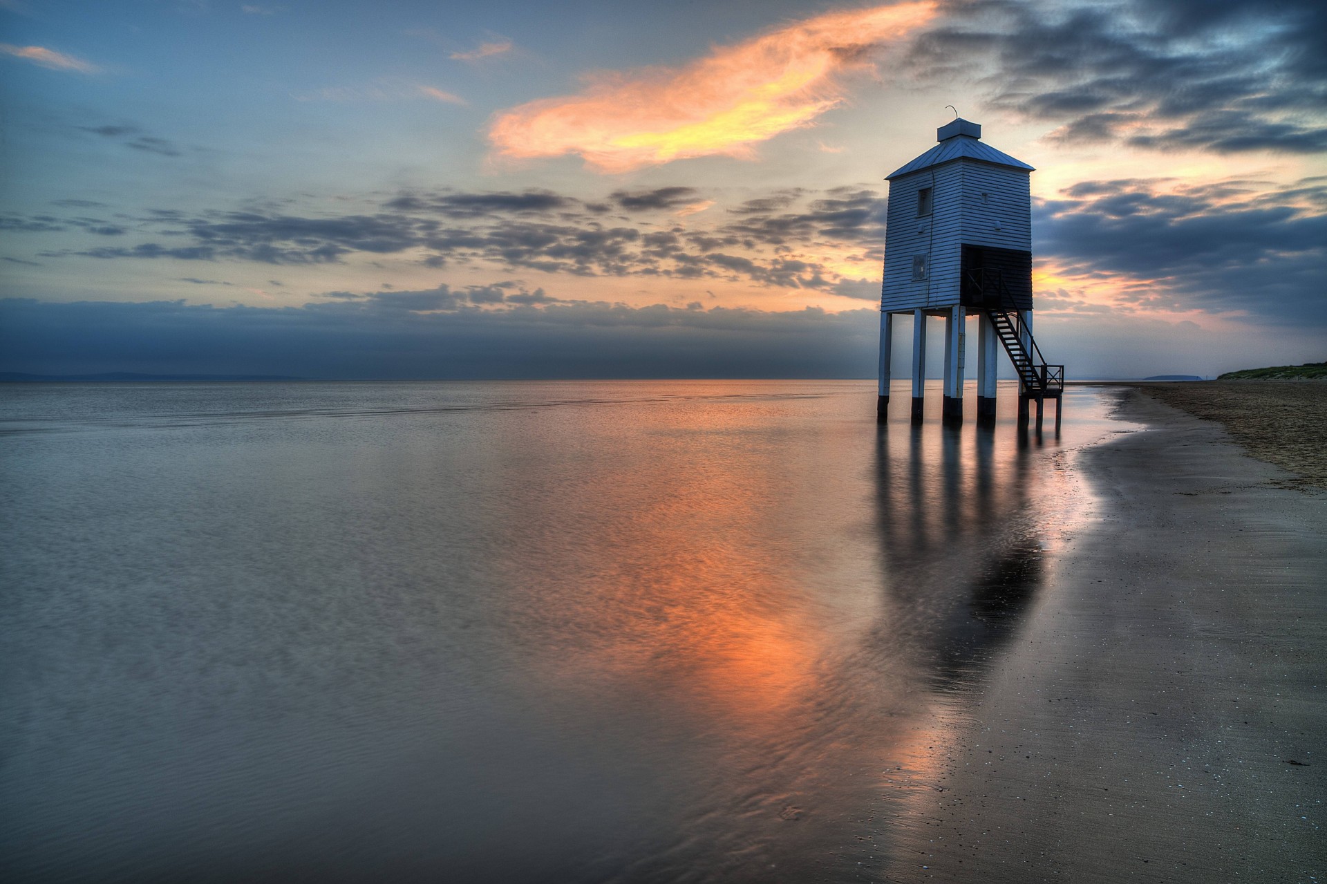 Les fantômes se soulèvent dans le comté de Somerset au Royaume-Uni le soir, quand la baie, le ciel bleu et rose et les nuages