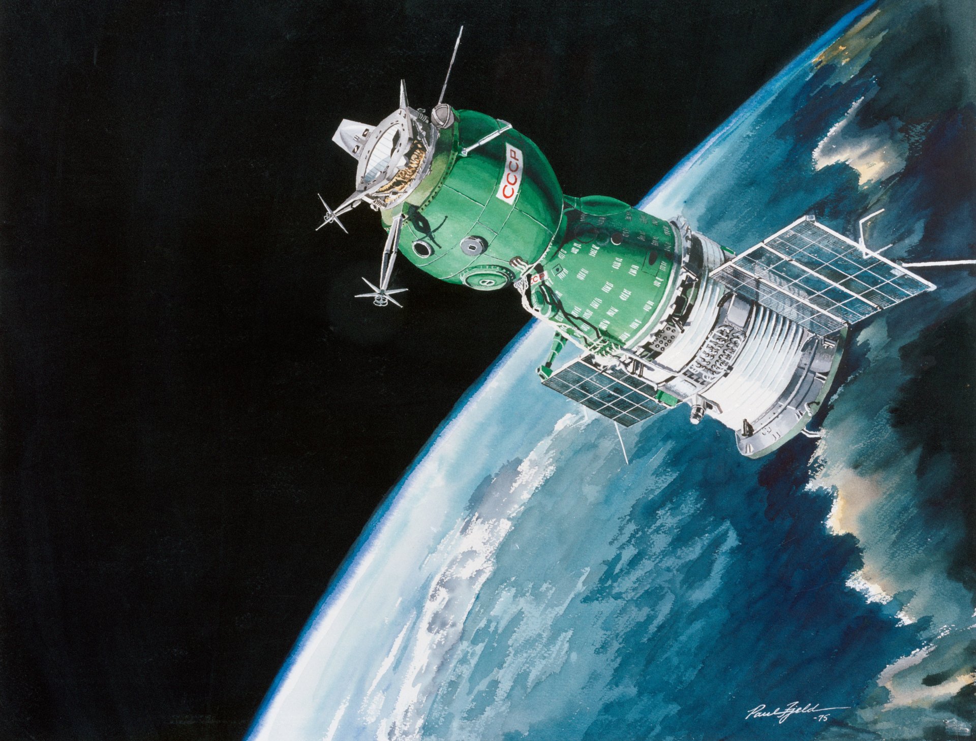 Station Soyouz sur fond de planète Terre dans l'espace ouvert