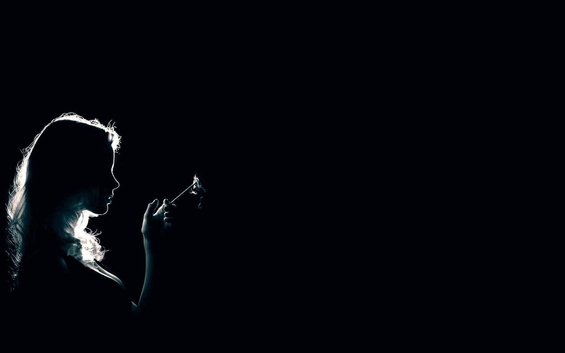 Profil de la jeune fille avec une cigarette sur fond sombreProfil de la jeune fille avec une cigarette sur fond sombre