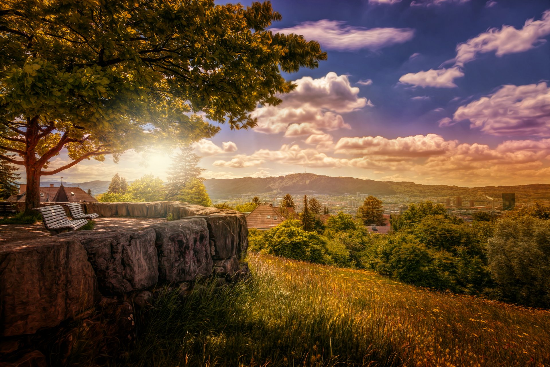 Vue panoramique sur la vallée avec de beaux nuagesVue panoramique sur la vallée avec de beaux nuages