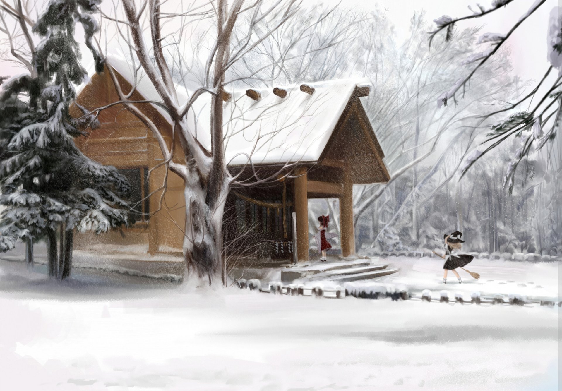 Dessin représentant deux filles et une maison sur la neigeDessin représentant deux filles et une maison sur la neige